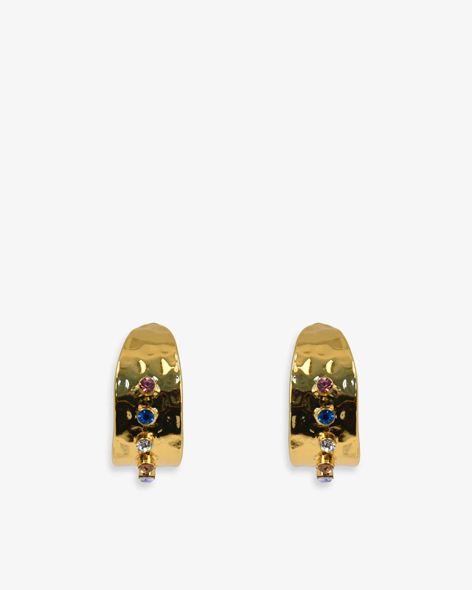 Brighten your look with the Amaris Gold Hoop Earrings. A modern twist on classic hoops. Crafted in 16k gold plating with multi-coloured stones, these half-hoops add playful sparkle to both casual and dressy outfits. Hypoallergenic, and easy to wear, they’re the perfect everyday statement earrings.