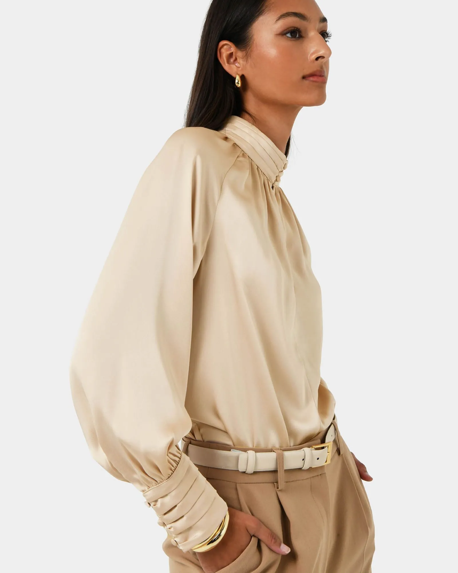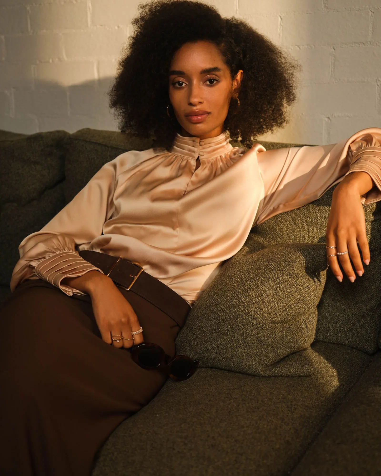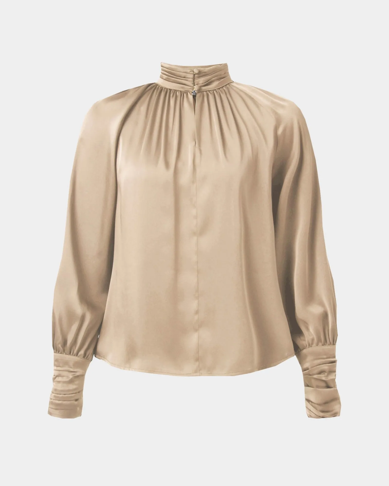 Elevate your wardrobe with this chic piece – the Anna Pleated Satin Blouse. Featuring a mock neckline with delicate pleating details, it is made from luxurious satin for a touch of elegance. It is designed with a front keyhole and loop button closure, while the soft gathering and balloon sleeves add a feminine, structured look. It is lightweight, making it ideal for both casual and formal occasions.