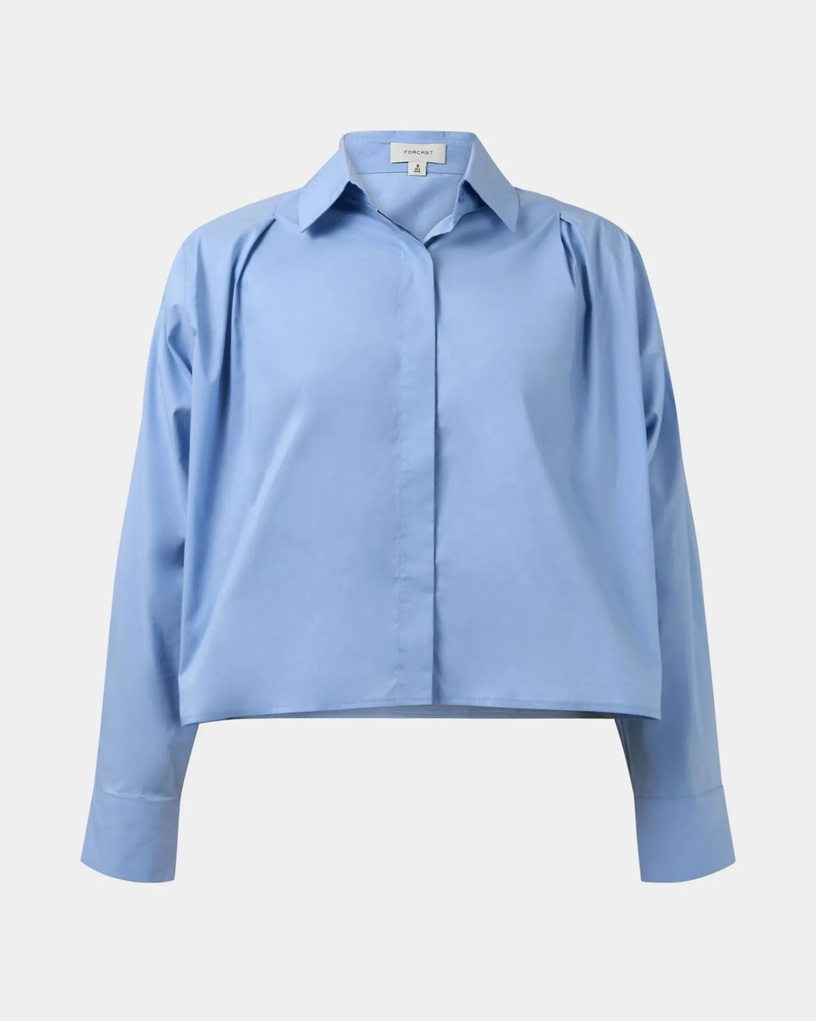 Introducing the Baire Pleated Crop Shirt, it is crafted from a lightweight cotton blend for comfortable wear. The relaxed-fit top features a cropped length and long sleeves, creating a versatile balance that makes it a staple for elevated casual styling.