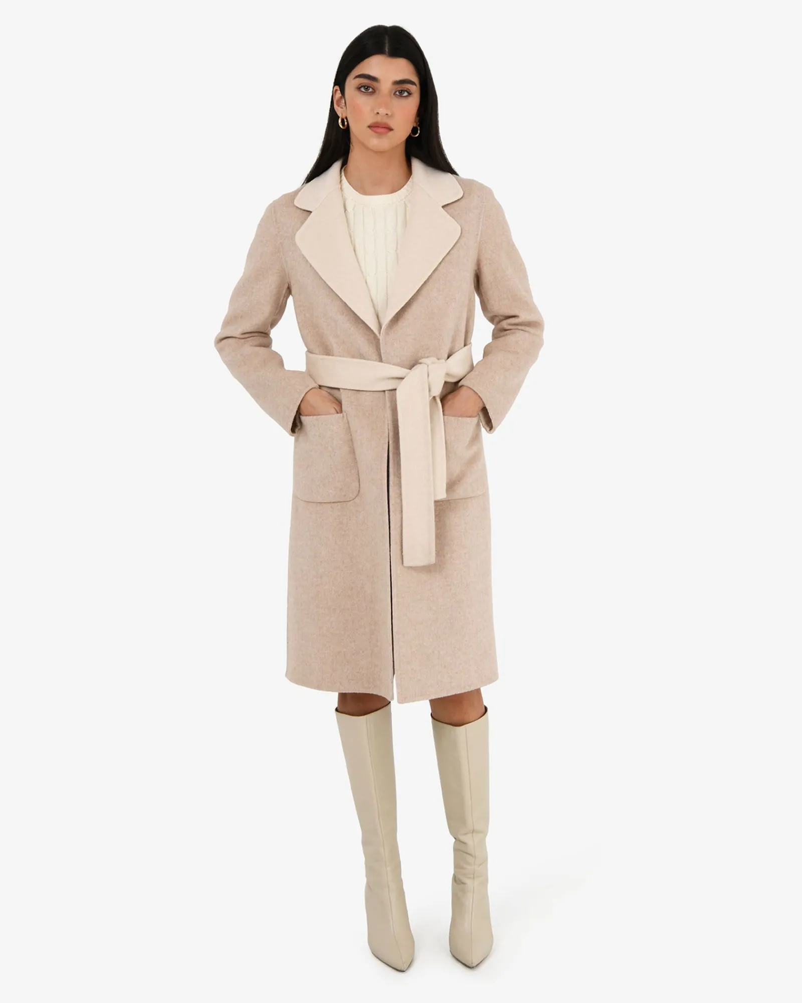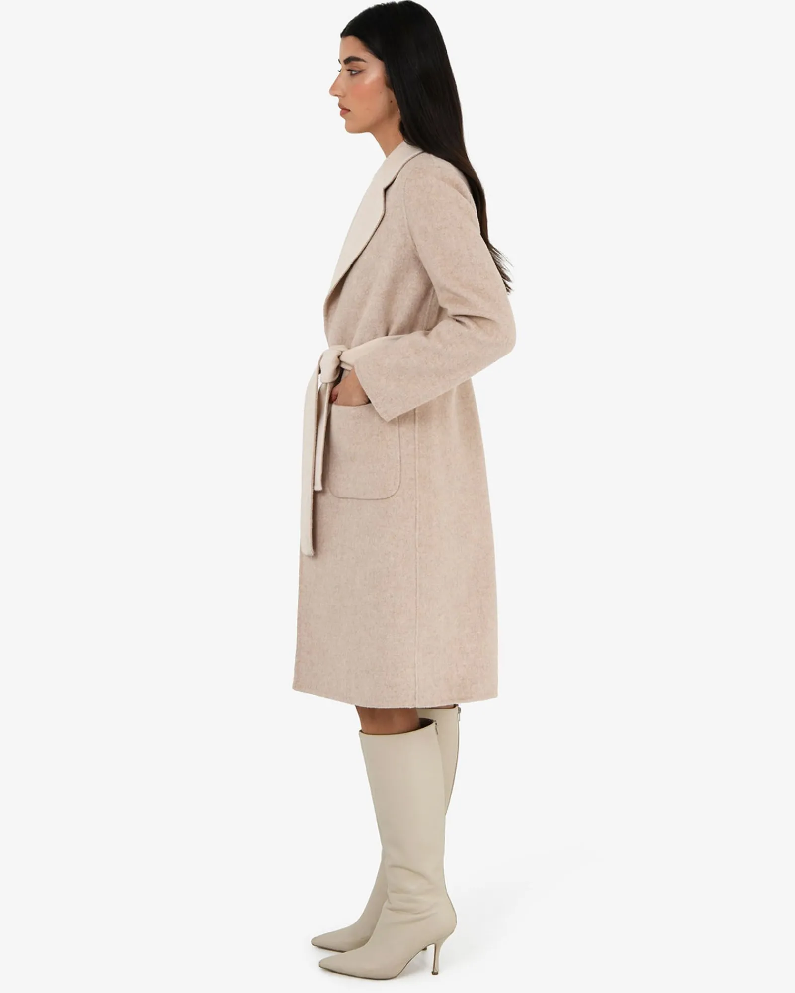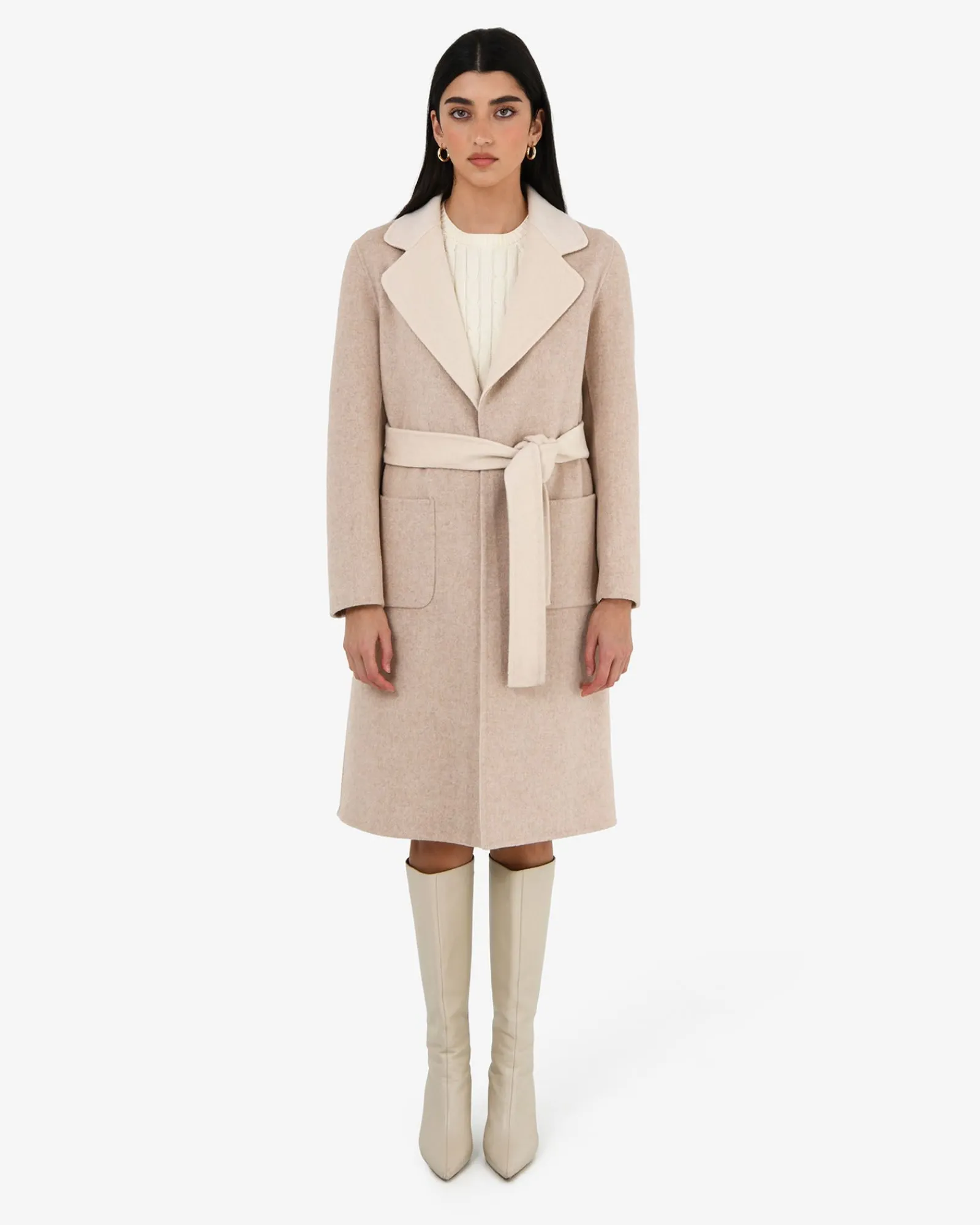 Make winter layering look effortlessly chic with the Camille Wool Tie Coat. Featuring a wrap silhouette designed to flatter your figure, the self-tie belt cinches the waist for a customisable fit, while the contrast-coloured lapel adds a modern, eye-catching detail. An ideal addition to your seasonal staples.
