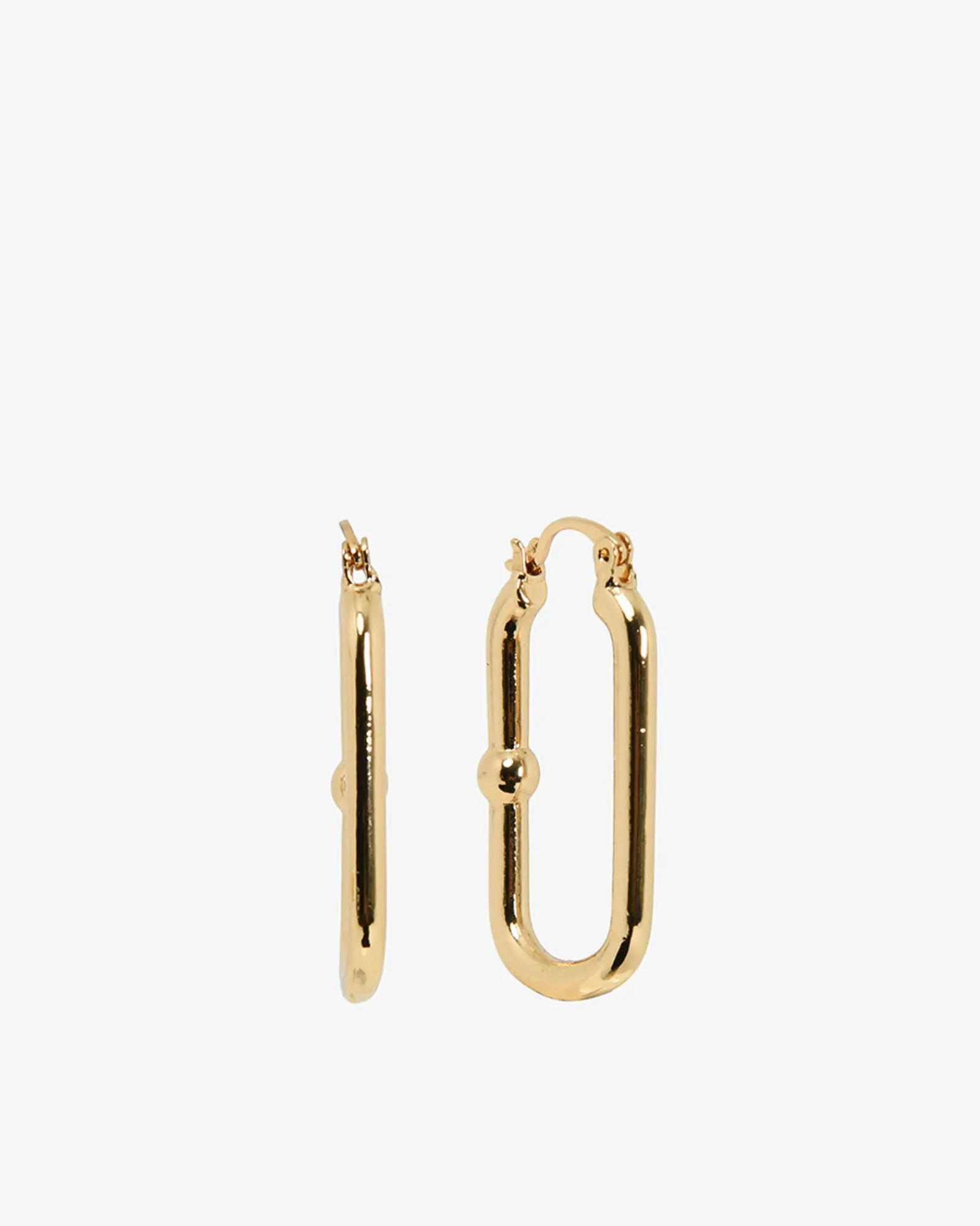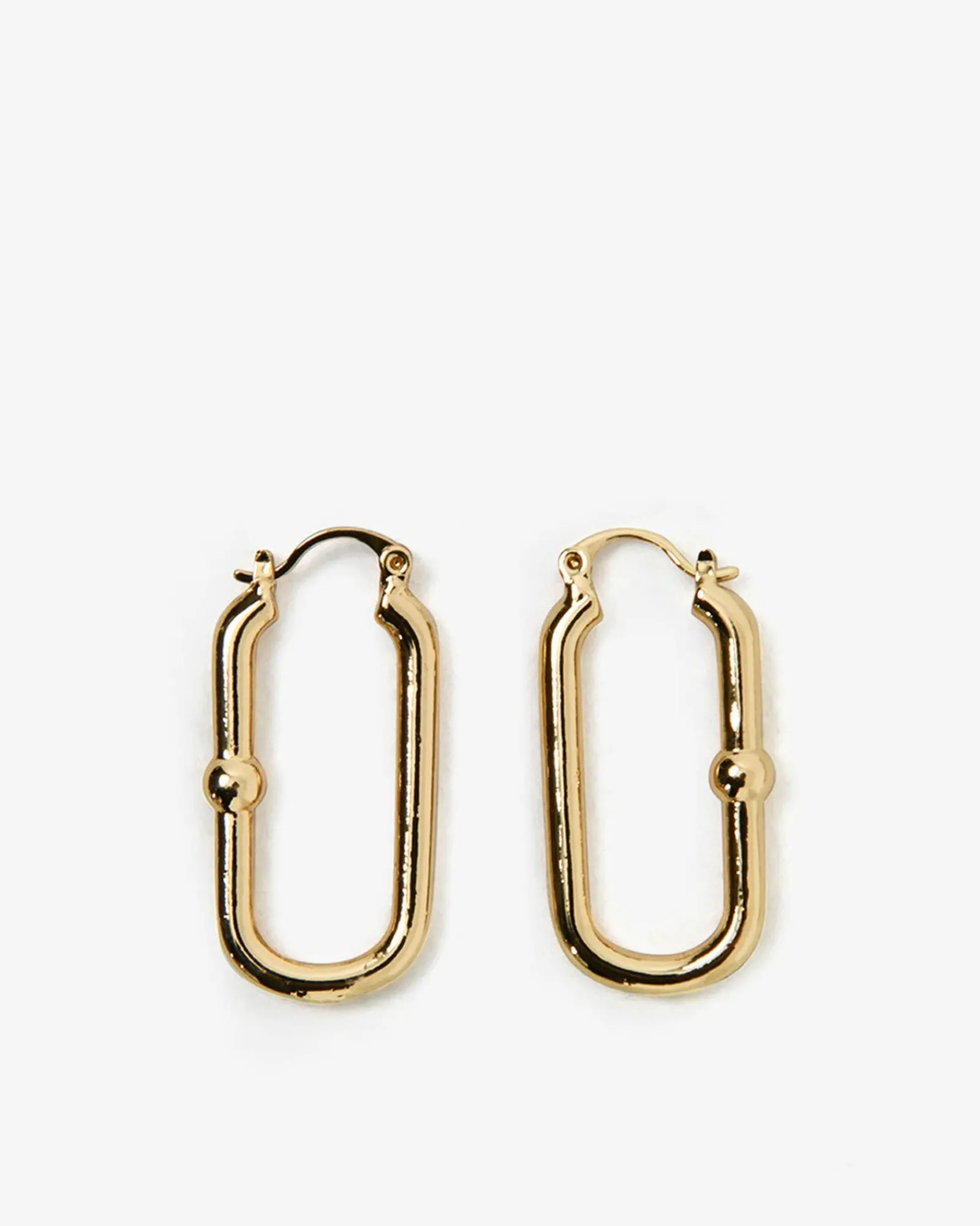 A modern twist on a classic. The Carmen Gold Earrings feature an elongated oval hoop with a spherical detail, finished in a radiant gold tone.