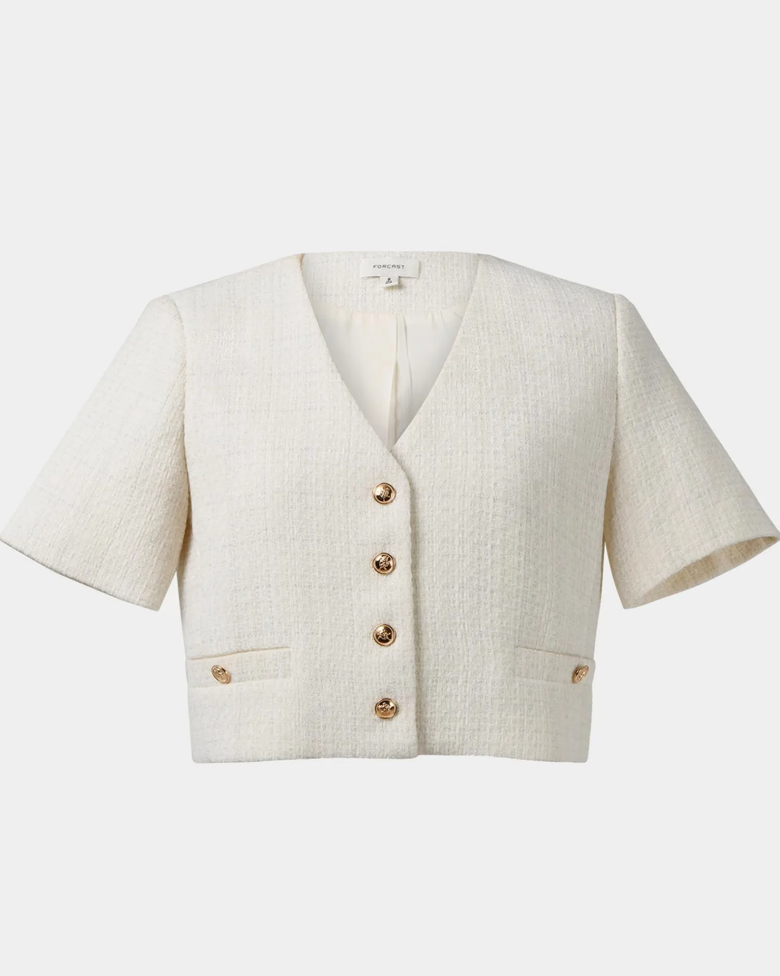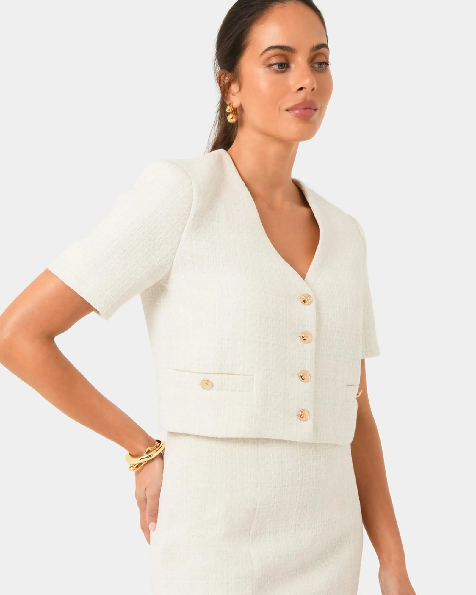 Chic, cropped, and effortlessly polished, the Carmen Tweed Crop Jacket has a tailored fit, a sleek V-neckline, and elegant gold-tone buttons. With its tweed fabrication, the jacket adds instant sophistication to any look. Short sleeves and faux pockets complete the look, making it the ideal jacket for a refined finish.