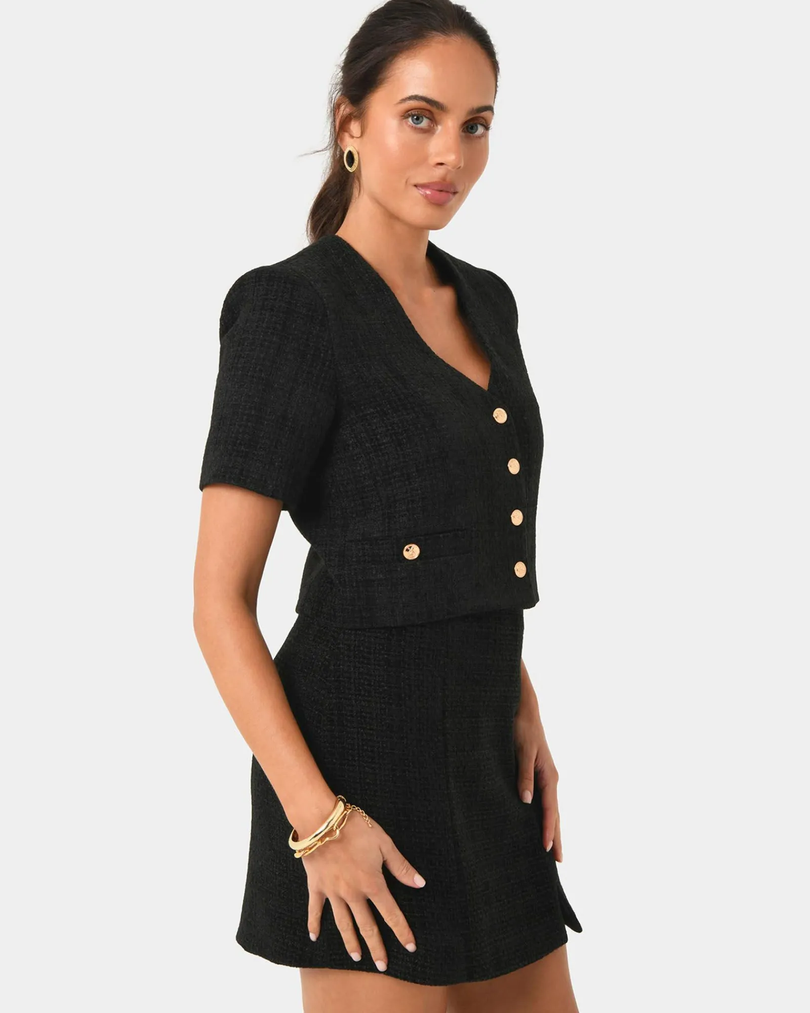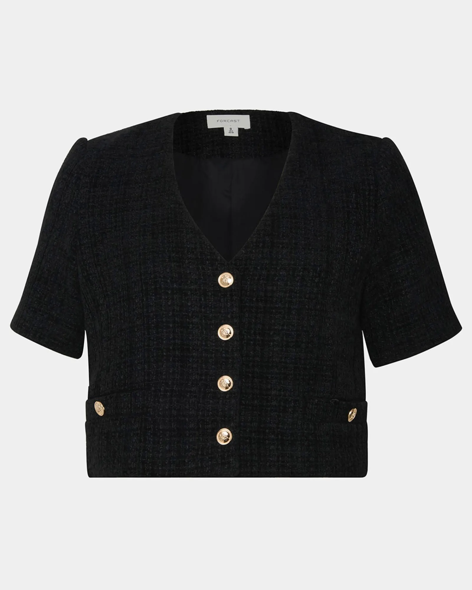 Chic, cropped, and effortlessly polished, the Carmen Tweed Crop Jacket has a tailored fit, a sleek V-neckline, and elegant gold-tone buttons. With its tweed fabrication, the jacket adds instant sophistication to any look. Short sleeves and faux pockets complete the look, making it the ideal jacket for a refined finish.