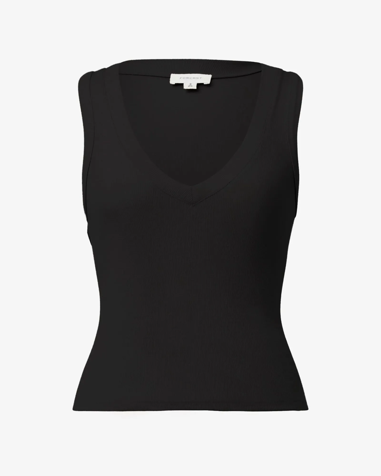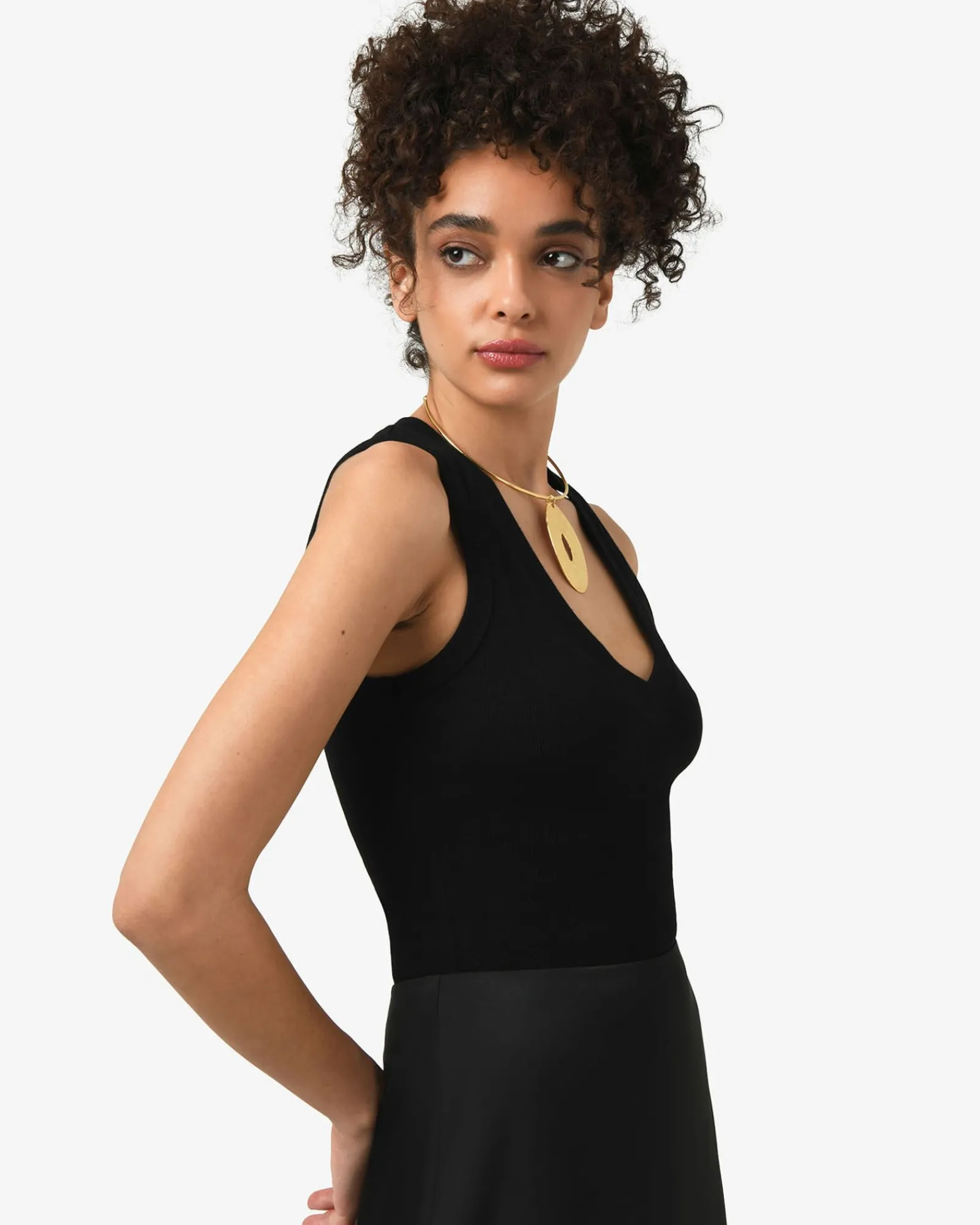 The Devon V-Neck Singlet is a soft ribbed knit piece with a flattering V-neckline, racer cut, and a body-skimming fit. Designed to gently hug your figure, it creates a smooth, flattering silhouette – perfect for tucking into high-waisted or relaxed-fit bottoms.