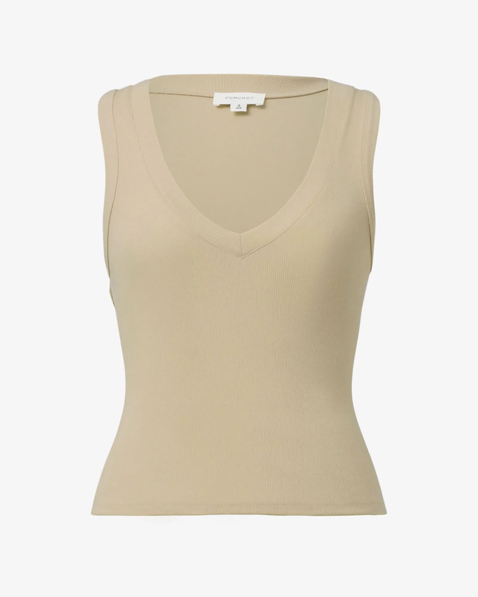 The Devon V-Neck Singlet is a soft ribbed knit piece with a flattering V-neckline, racer cut, and a body-skimming fit. Designed to gently hug your figure, it creates a smooth, flattering silhouette – perfect for tucking into high-waisted or relaxed-fit bottoms.