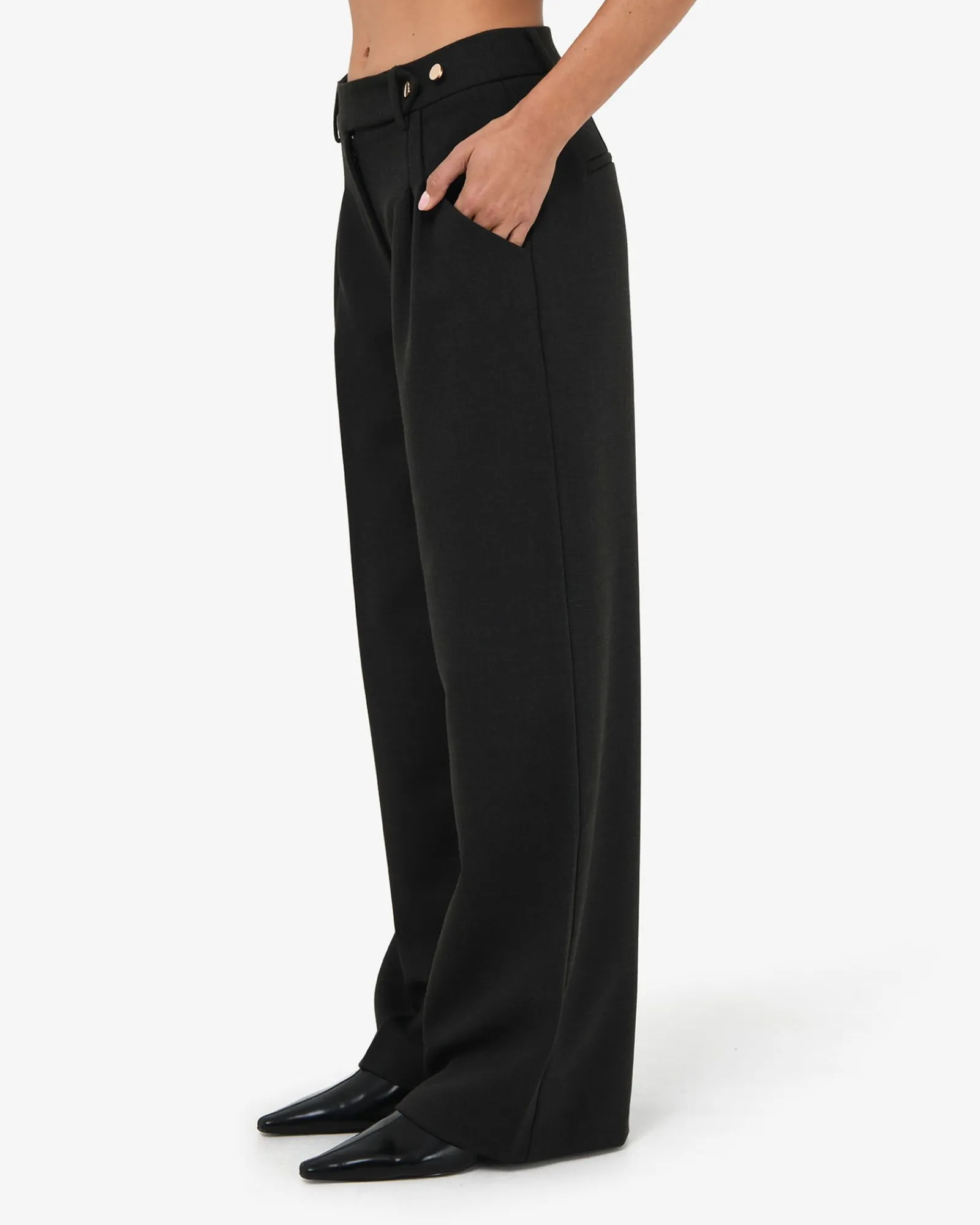 - Fixed waistband with belt loops, extended tab, and gold tone button detailing