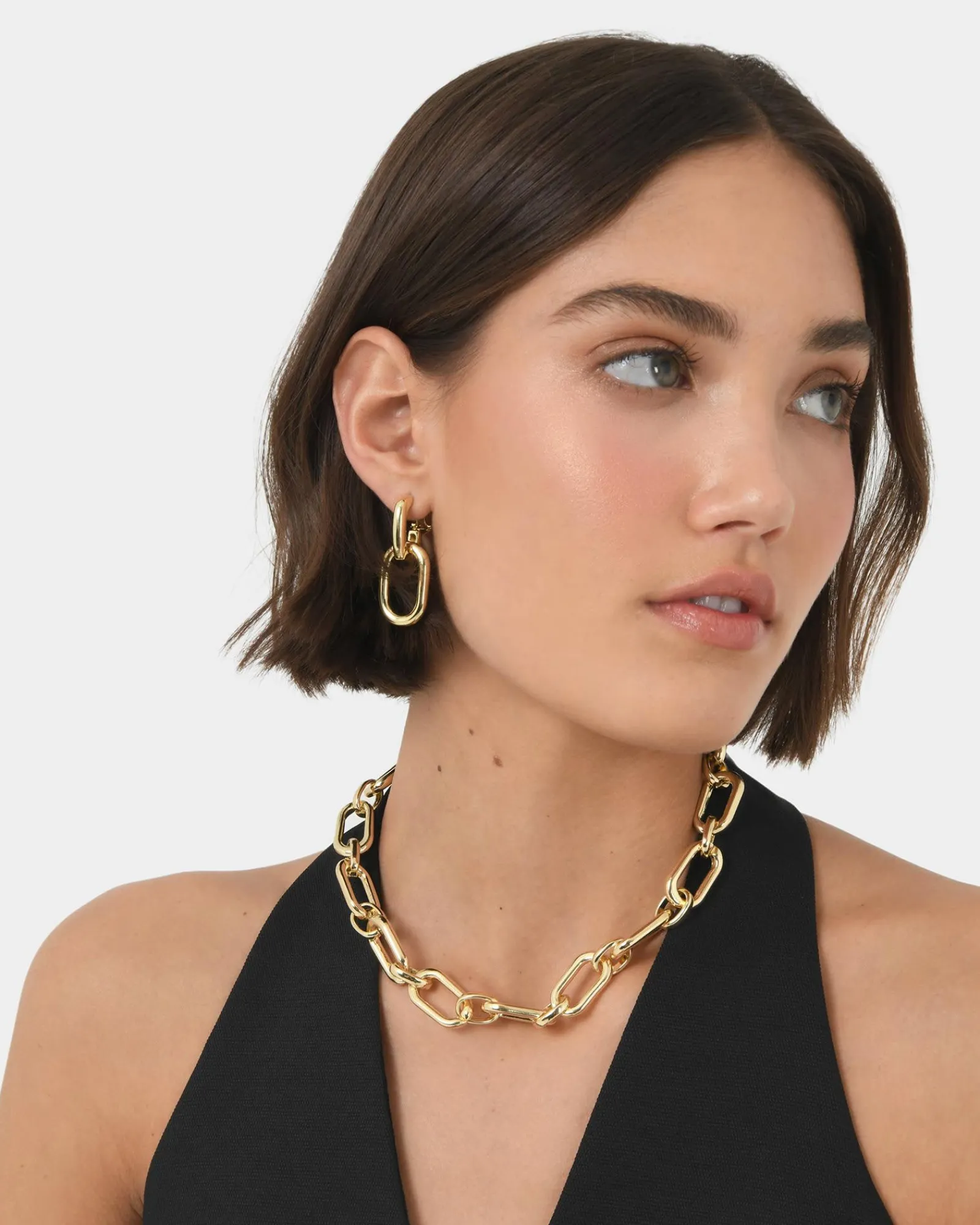 This bold and stylish Elvira Gold Plated Necklace features a chunky rectangular link chain. The oversized links create a striking and eye-catching statement piece.