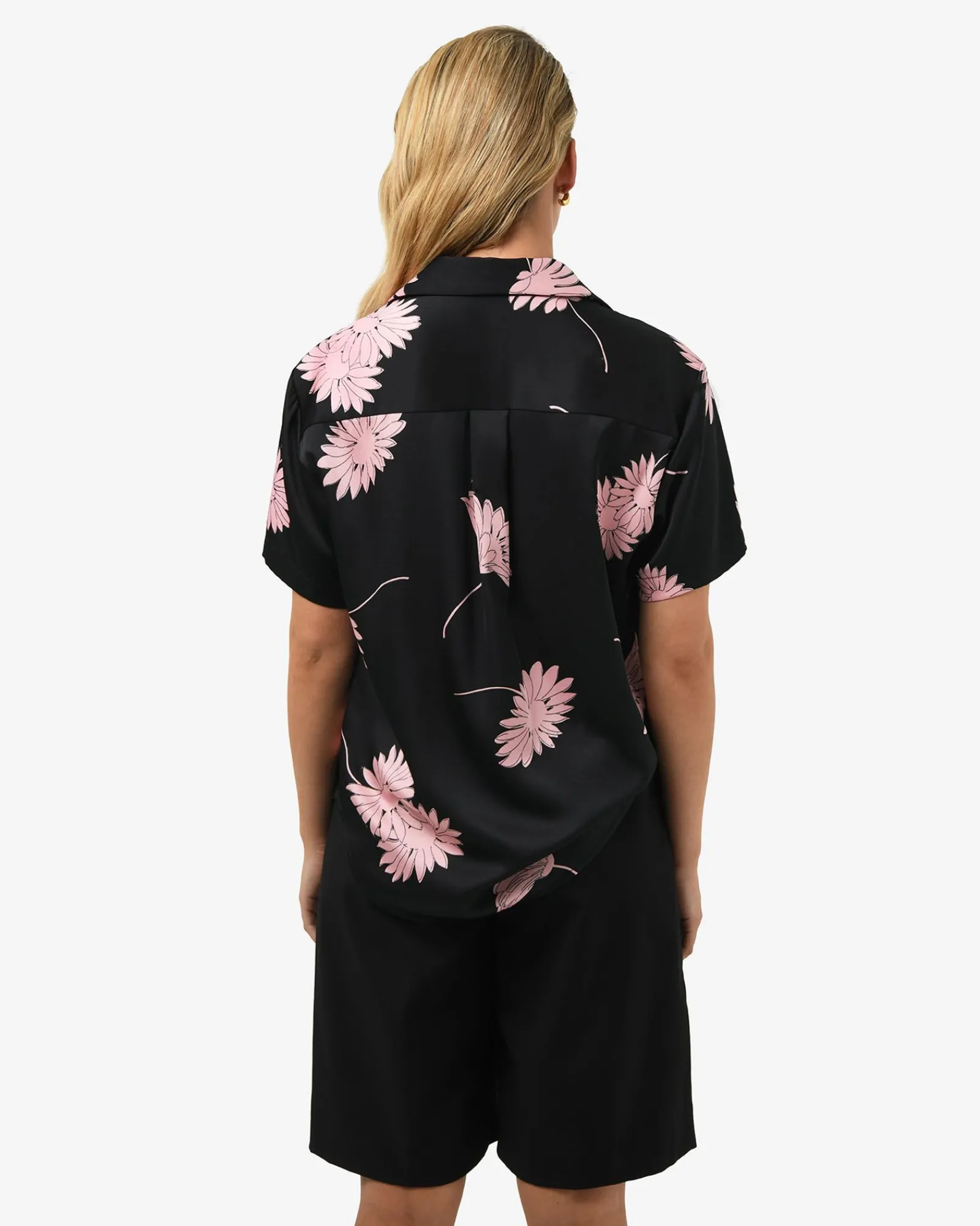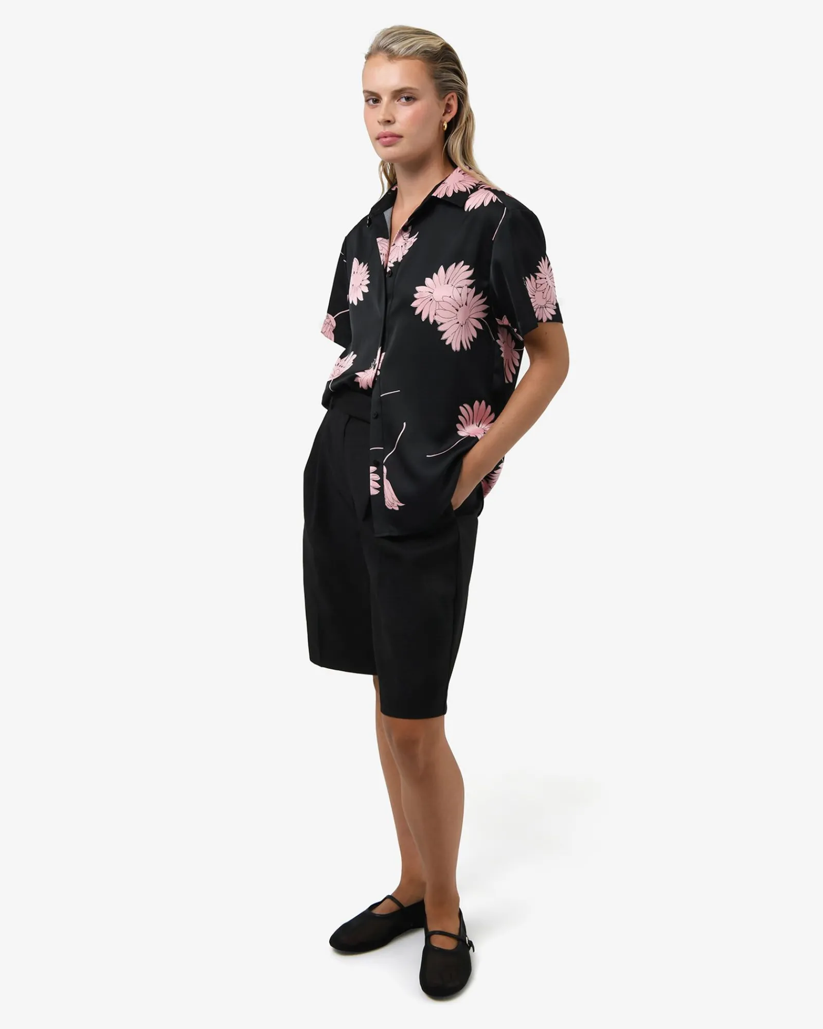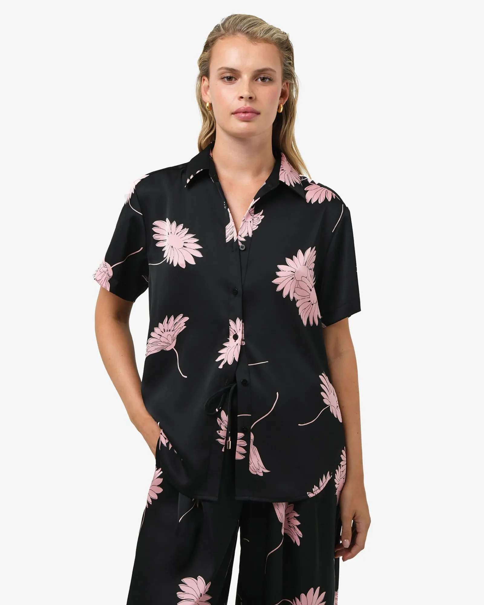 The Felicia Satin Shirt blends timeless charm with everyday ease. Crafted in a blush-pink floral print on smooth, luxurious satin, it drapes beautifully in a relaxed fit with a curved hemline. Perfect for elevating your casual wear.