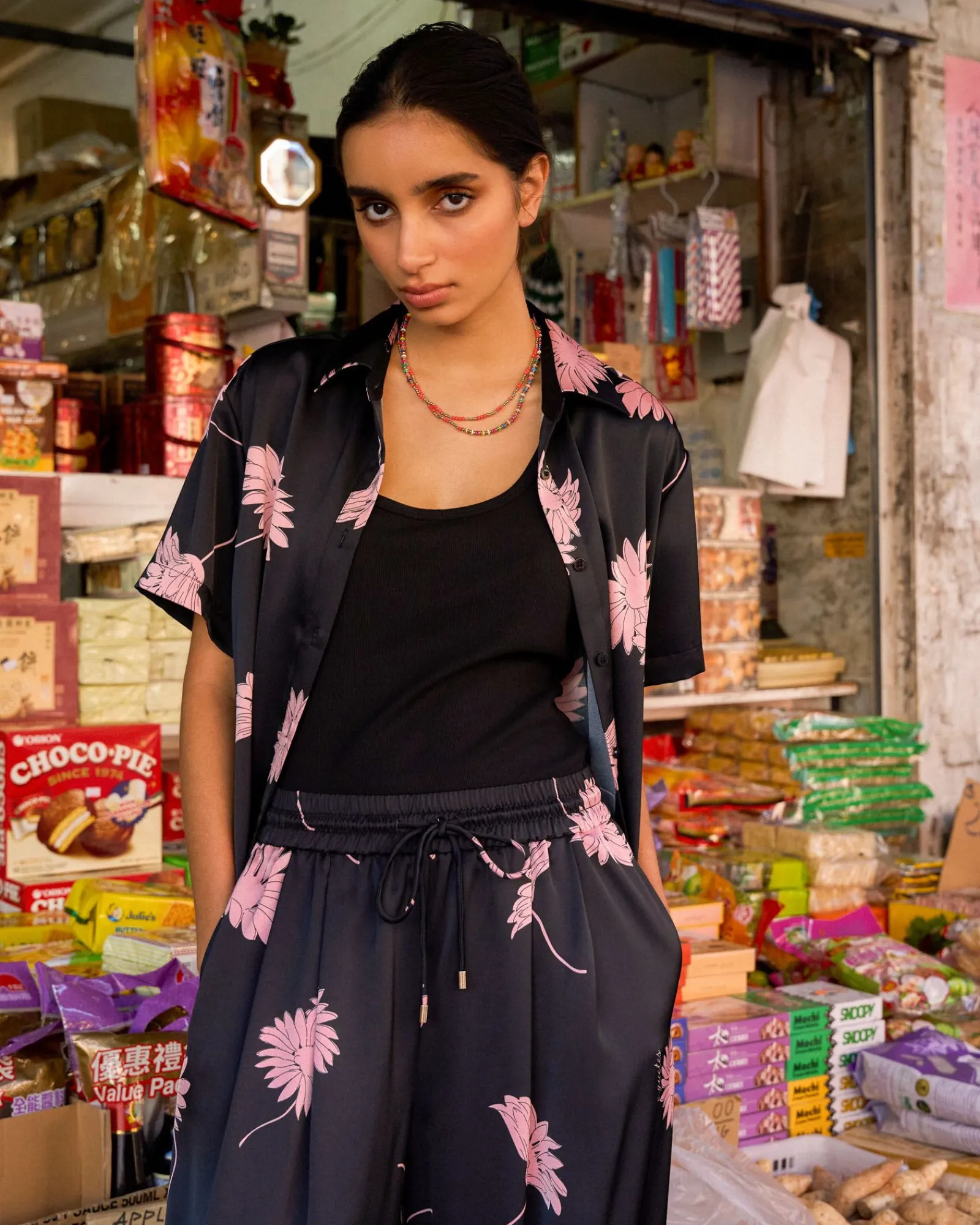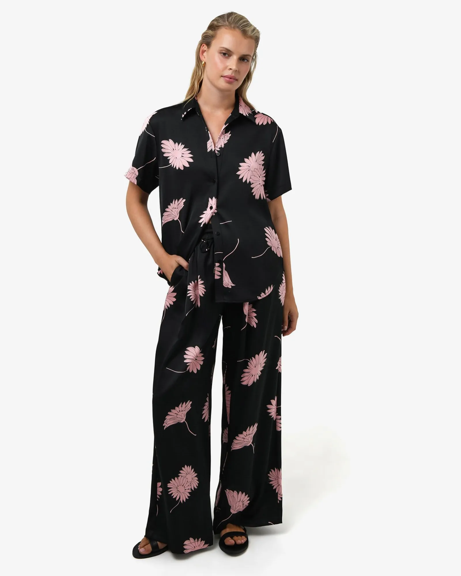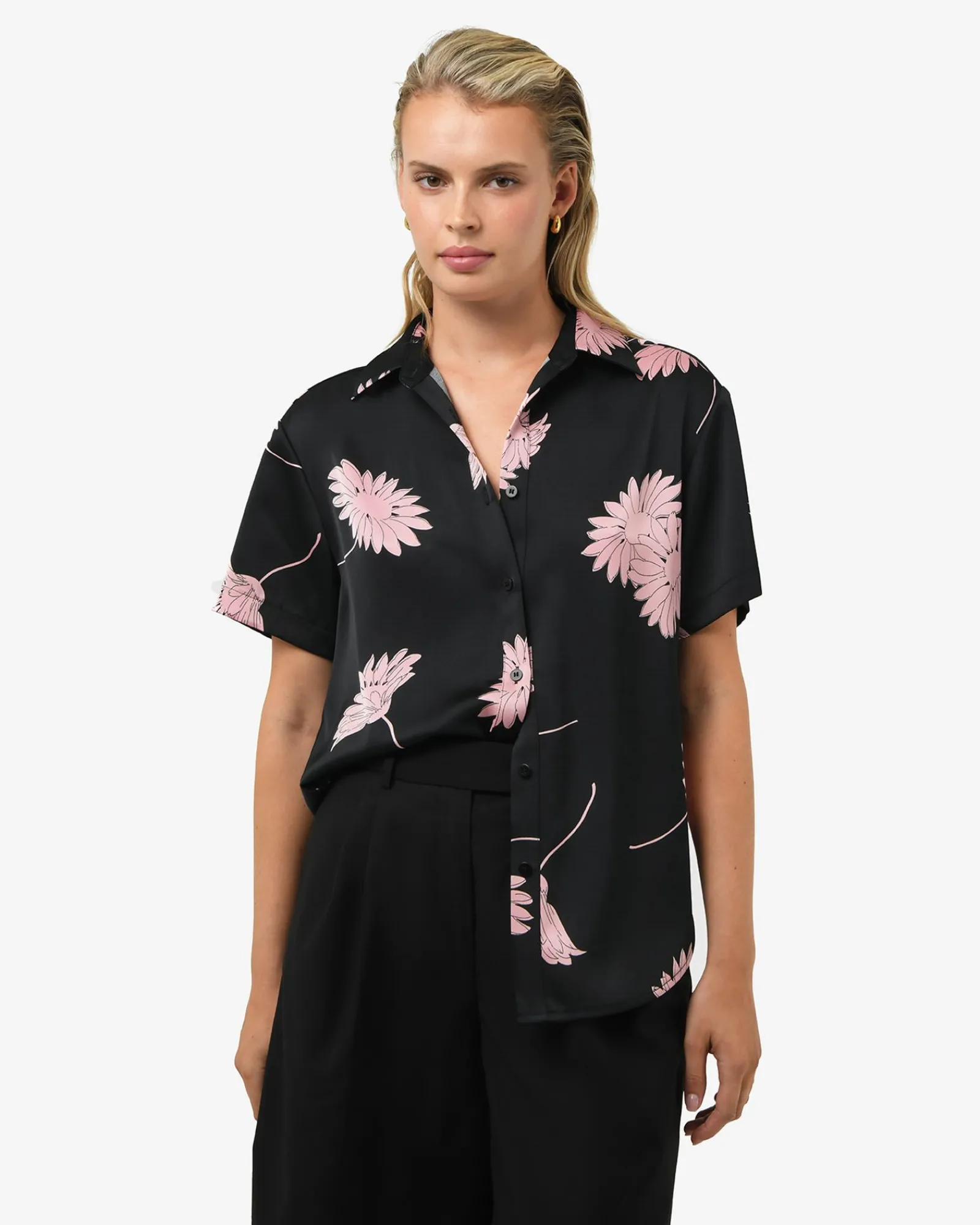 The Felicia Satin Shirt blends timeless charm with everyday ease. Crafted in a blush-pink floral print on smooth, luxurious satin, it drapes beautifully in a relaxed fit with a curved hemline. Perfect for elevating your casual wear.