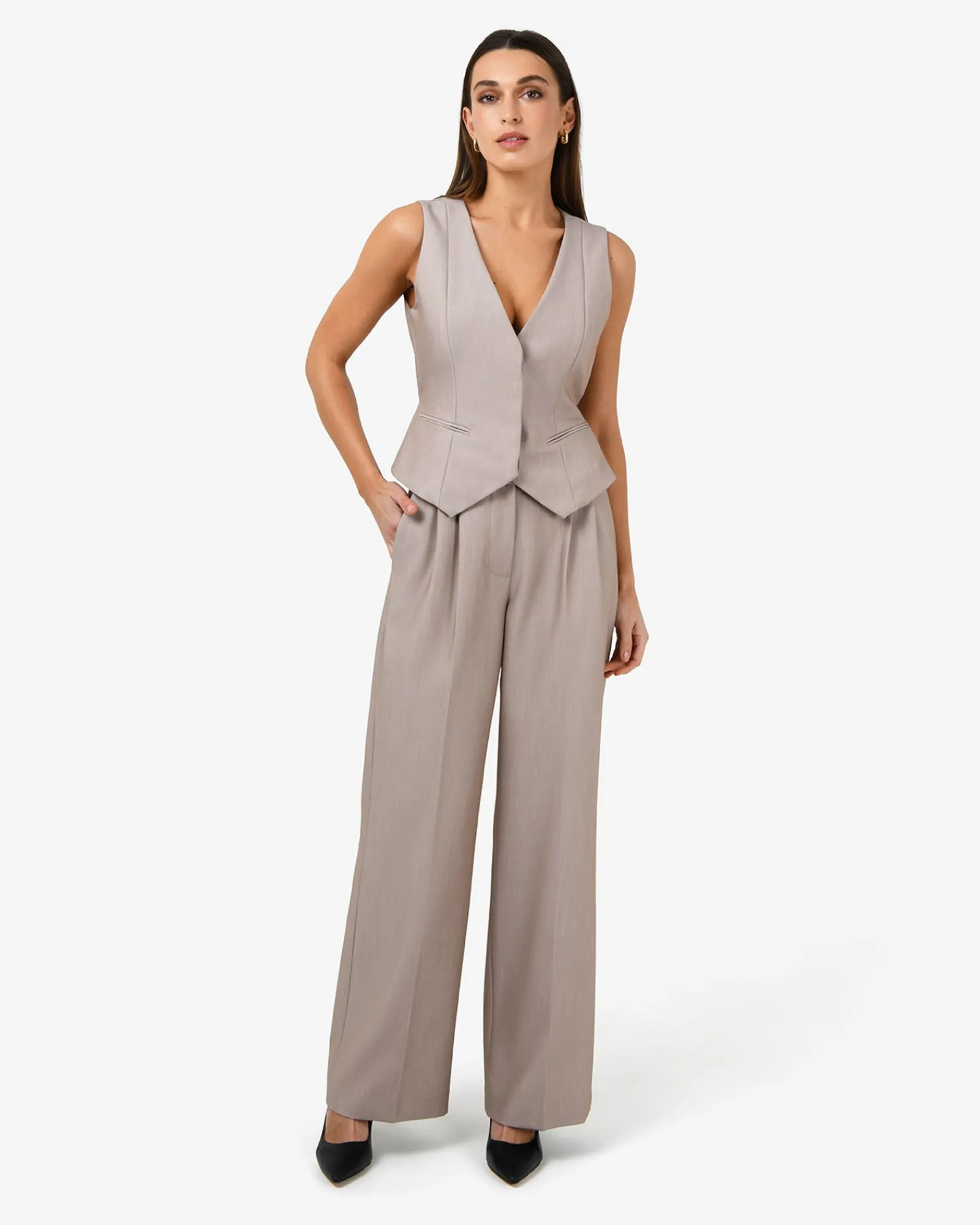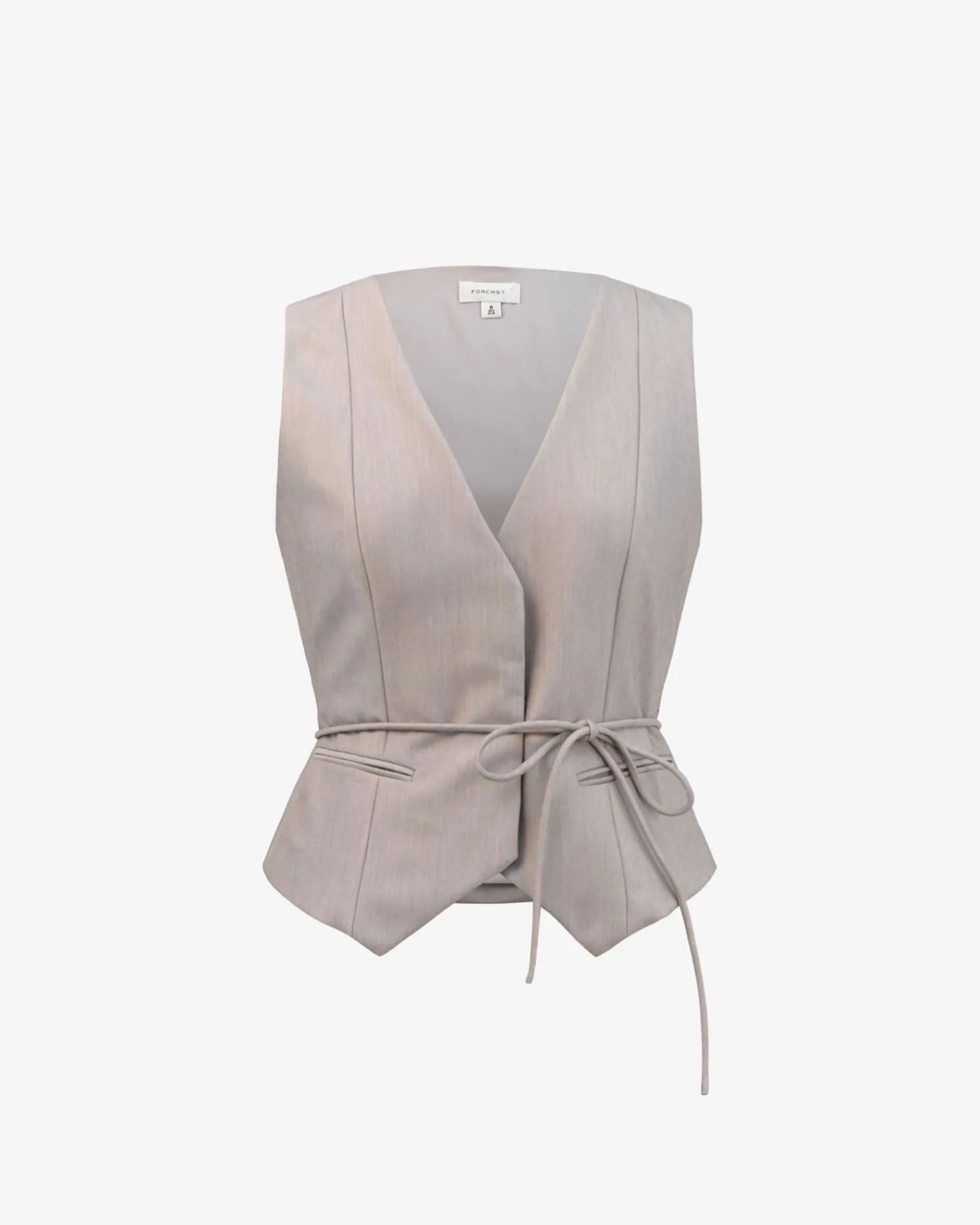 The Fitzroy Belted Vest is designed with princess seams and a deep V-neck for a flattering look. Its self-tie at the waist shapes the figure, while the asymmetrical hem, single-button closure, and functional front pockets add style and practicality – perfect for layering or wearing on its own.