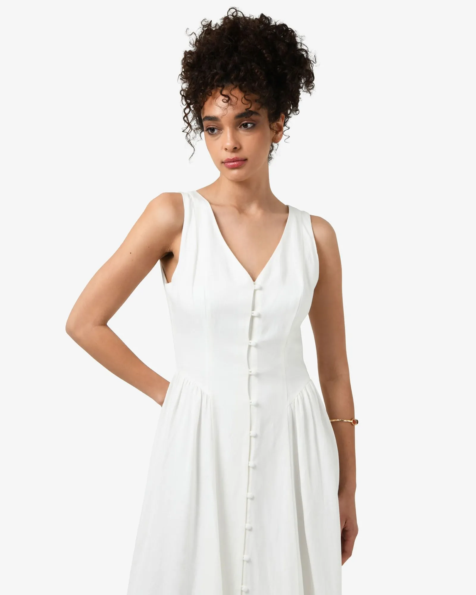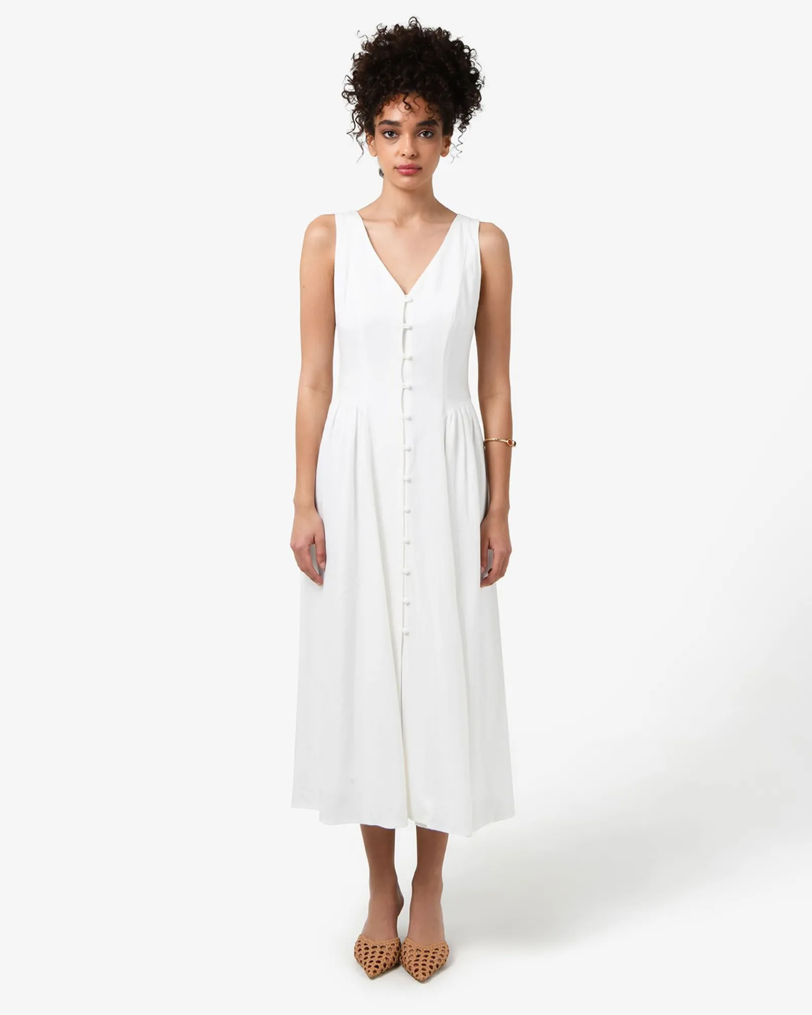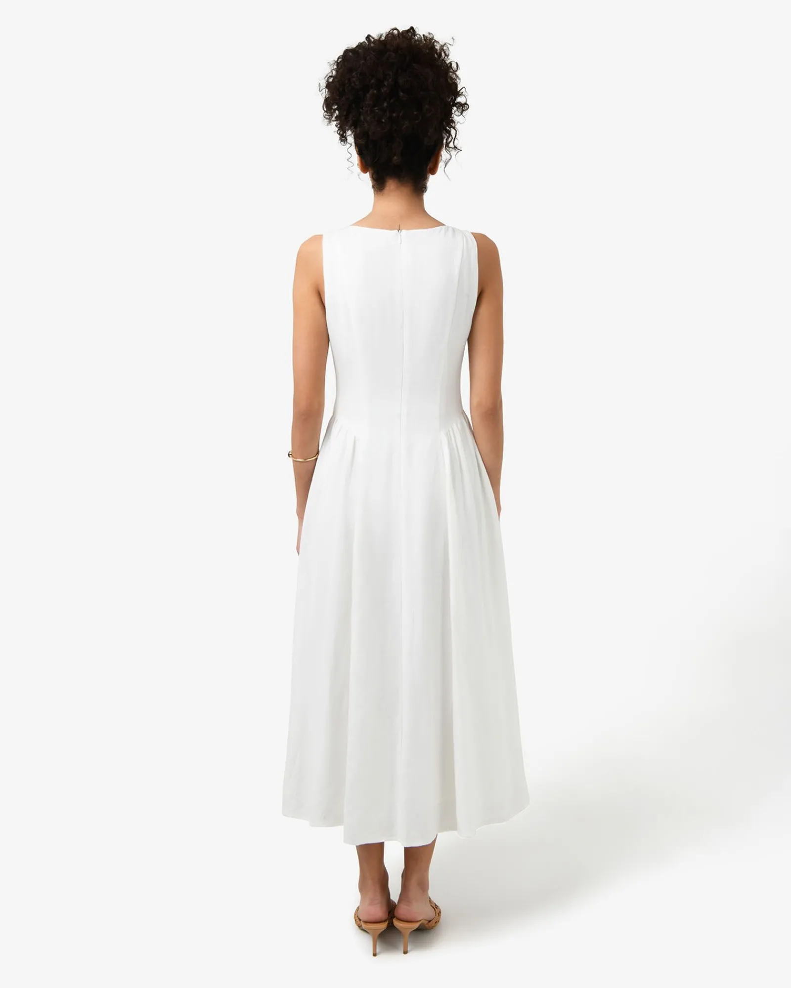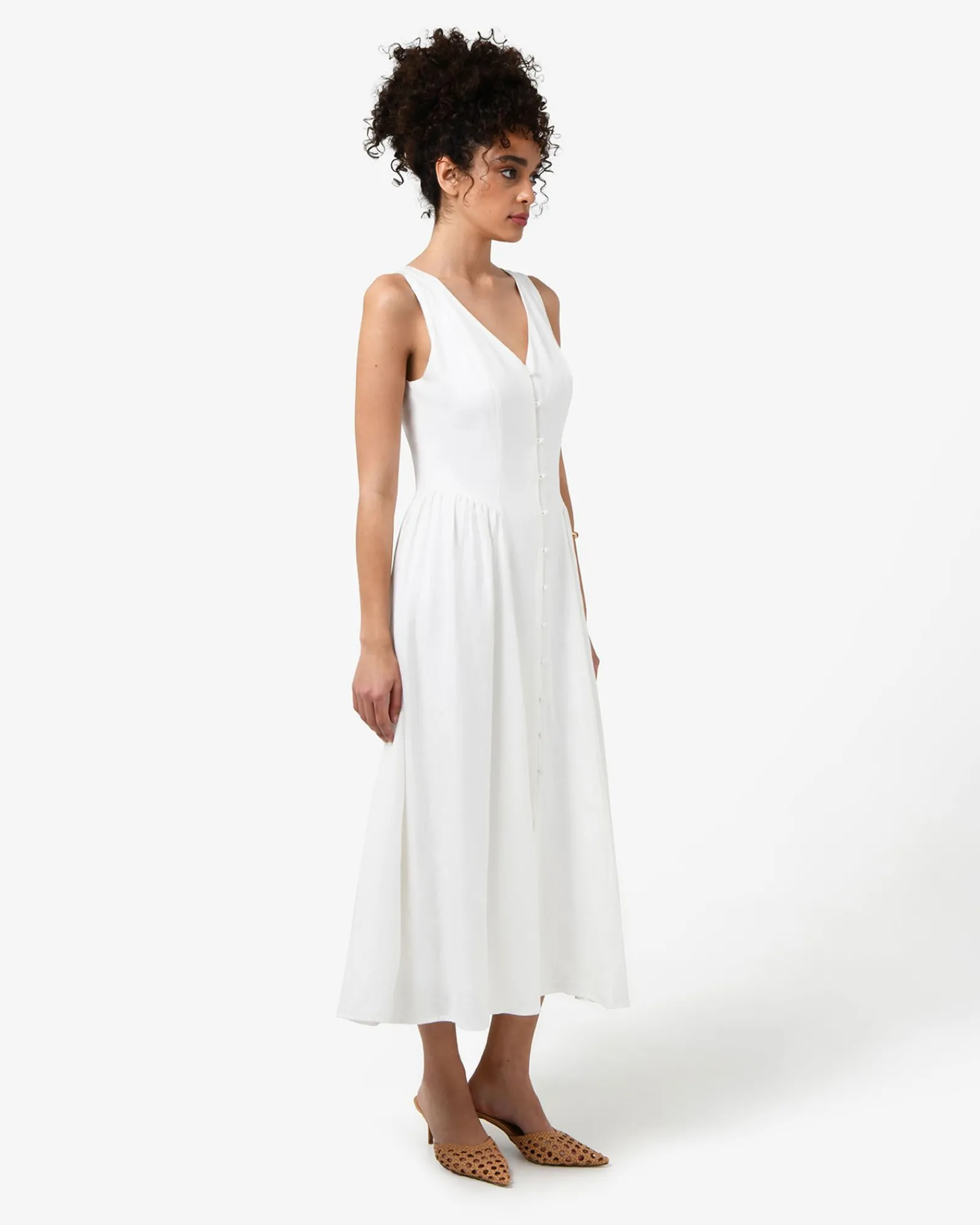 The Kendal Linen Blend Dress features a sleeveless design with a V-neckline, invisible back zipper and functional front loop buttons, while the lined midi skirt is finished with side gathering panels. The dress can be dressed up or down for both casual and occasion wear – style with your favourite accessories to complete the look.