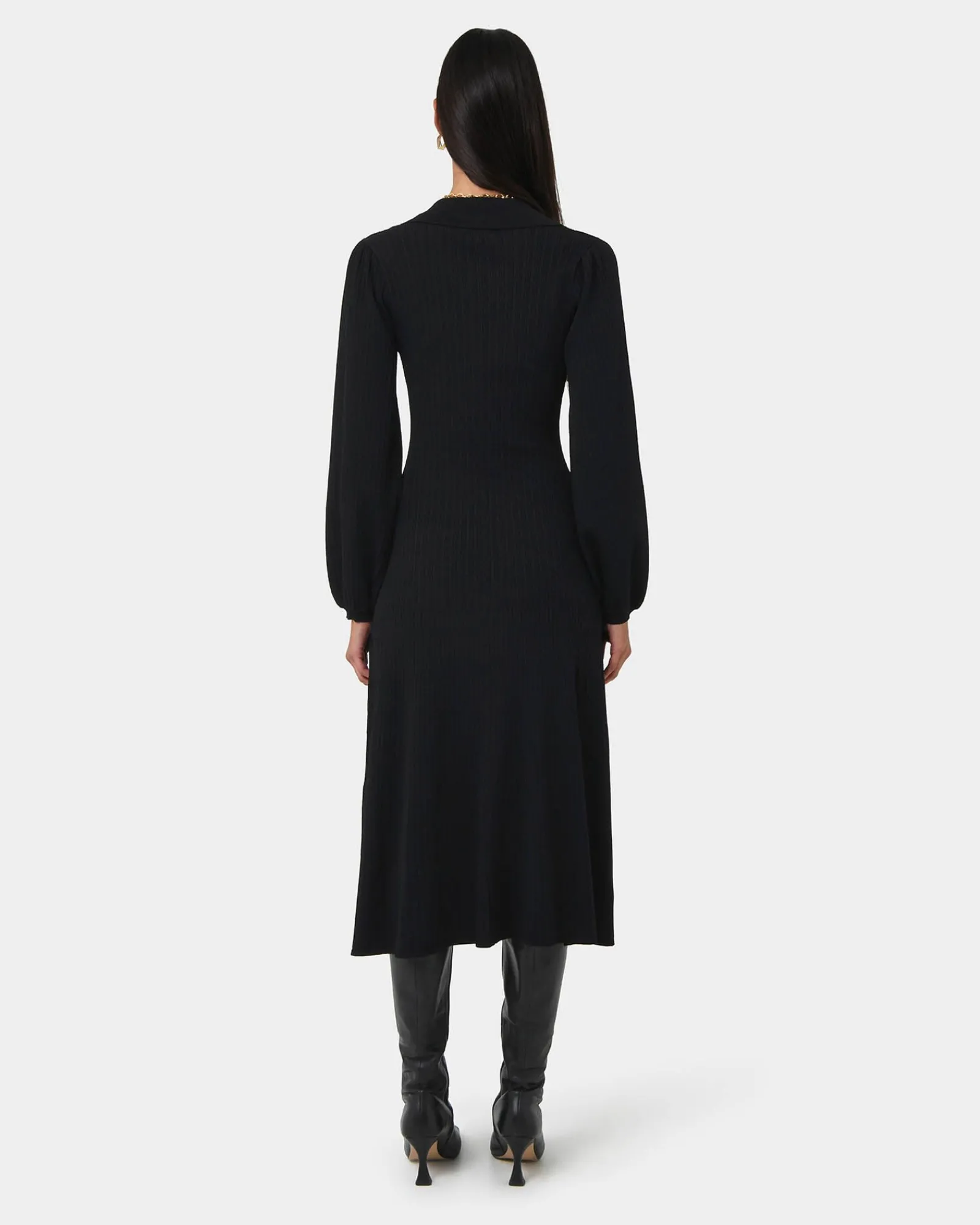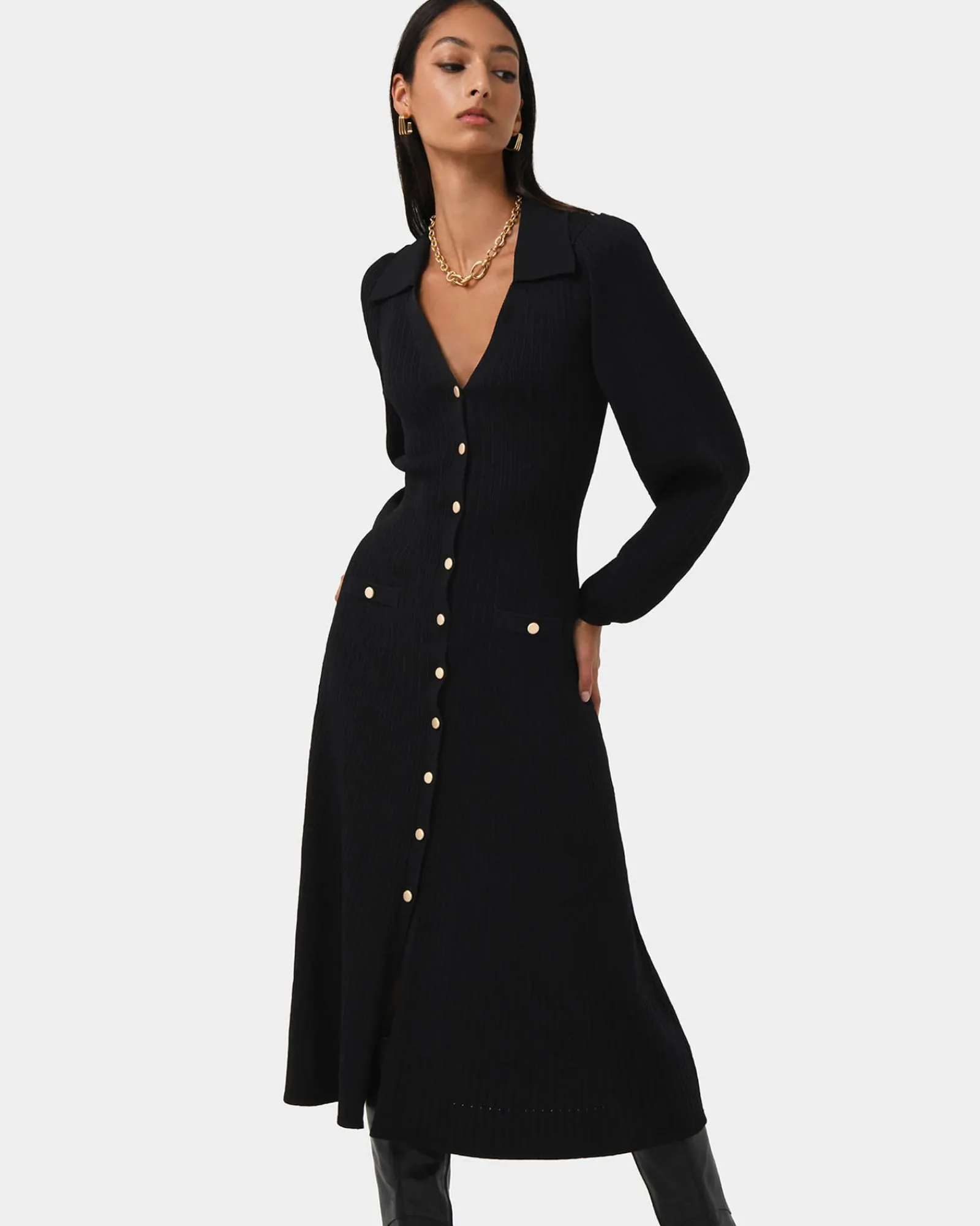Make a statement with the Lara Collar Midi Knit Dress and wear the dress with class and grace. Featuring a collared V-neckline, it is made from heavyweight ribbed knit fabric with just the right amount of stretch for a flattering fit. The centre front gold button closure adds a touch of poise, while the long balloon sleeves with ribbed cuffs offer a stylish, yet relaxed finish.