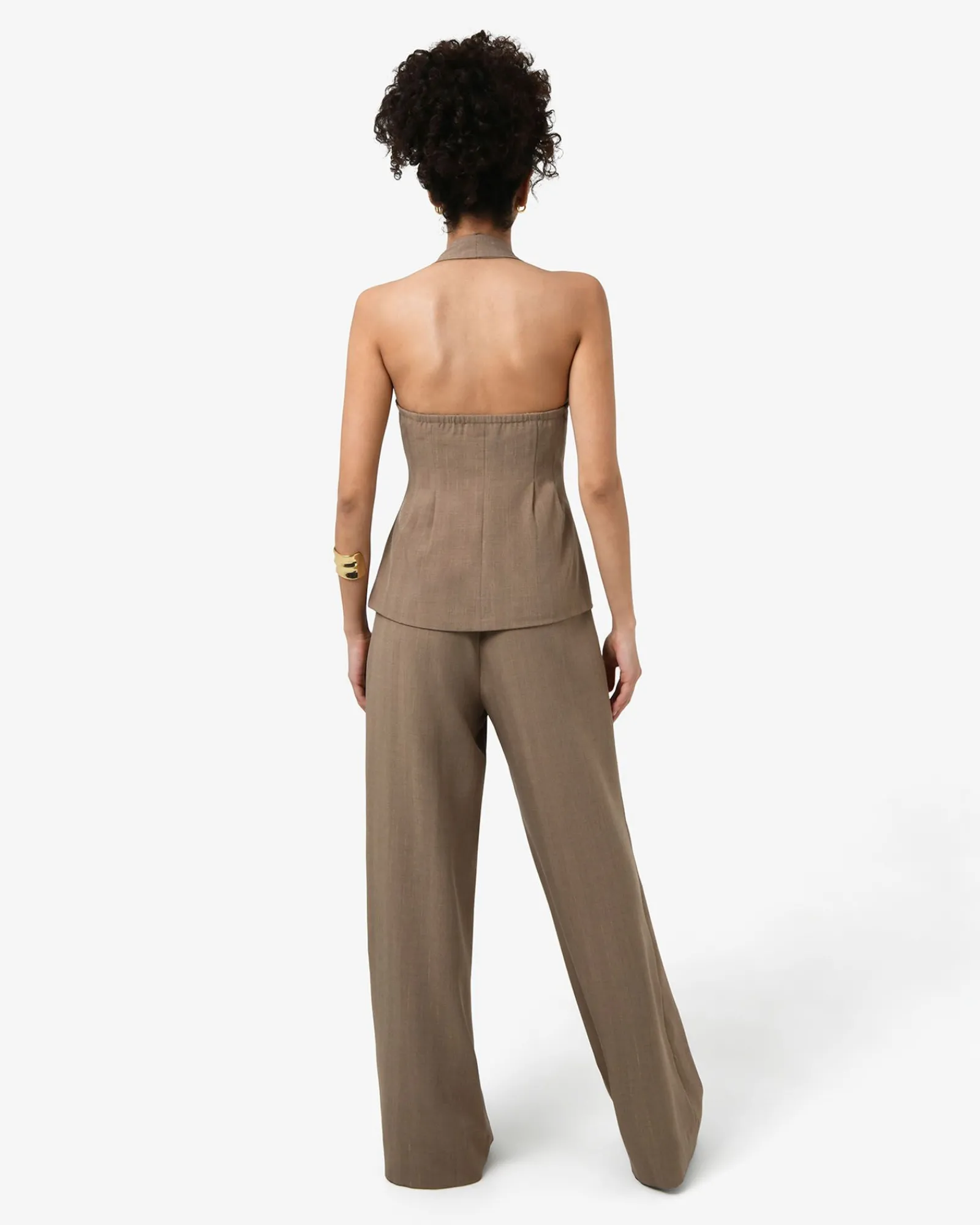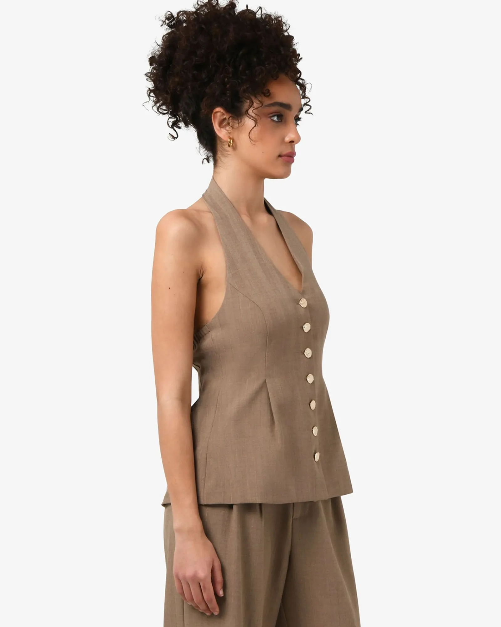Defined by its halter neckline, the Lola Halter Neck Peplum Vest showcases a fitted waist, subtle flared peplum hem, and gold-toned buttons down the front. Wear as a matching set with the Lola Lurex Blend Wide Leg Pant, or style it with tailored trousers or skirt for a look.
