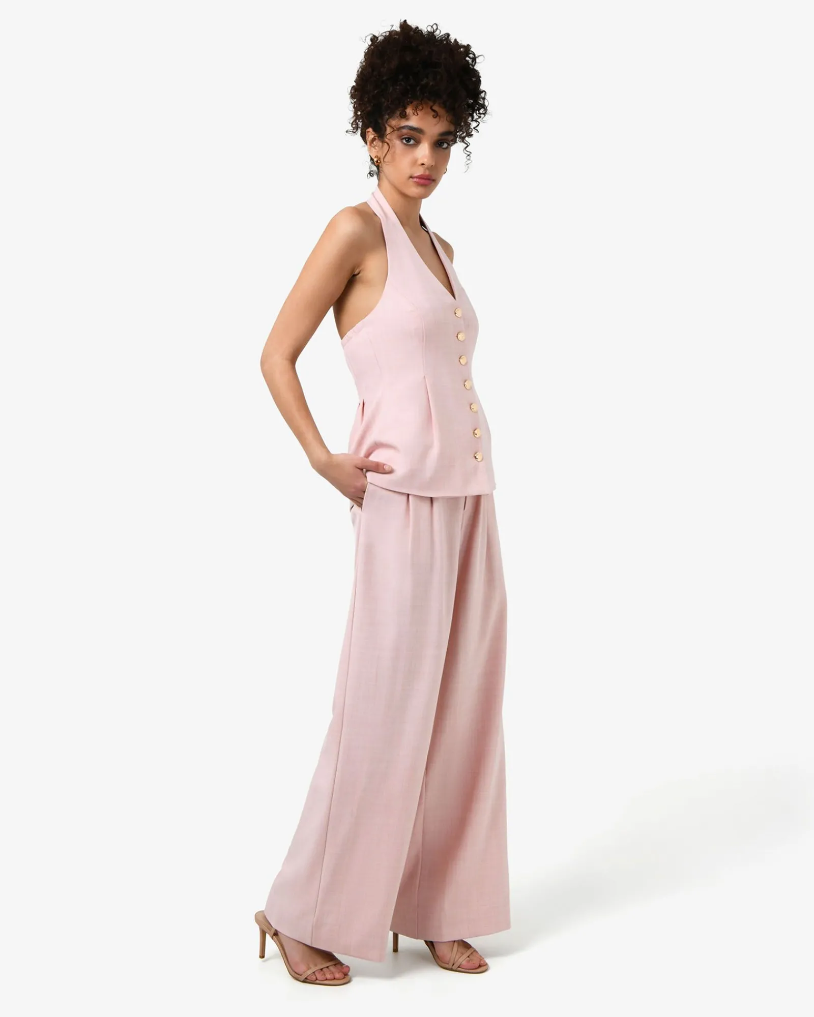 The Lola Lurex Blend Wide Leg Pant features classic tailoring with a high-rise waist, double front pleats, and a wide-leg silhouette. Finished with a tailored waistband, side pockets, and back darts, Pair it with the matching Lola Halter Neck Peplum Vest for a coordinated set, or style it with fitted tops, blouses, or blazers for versatile dressing.