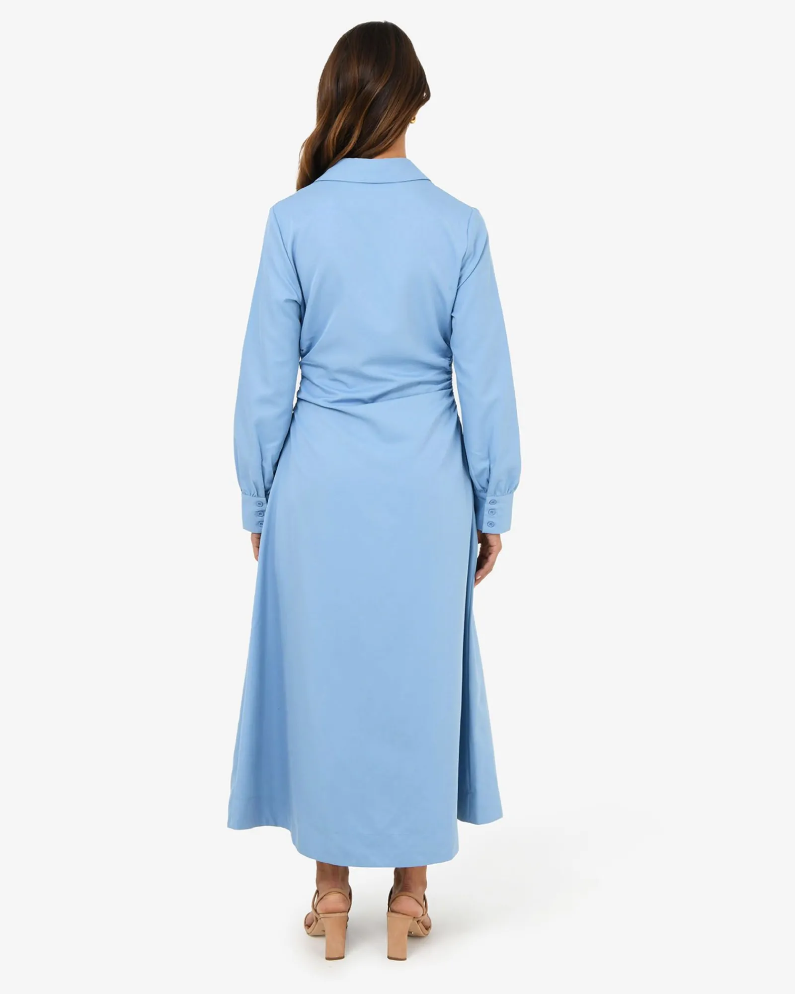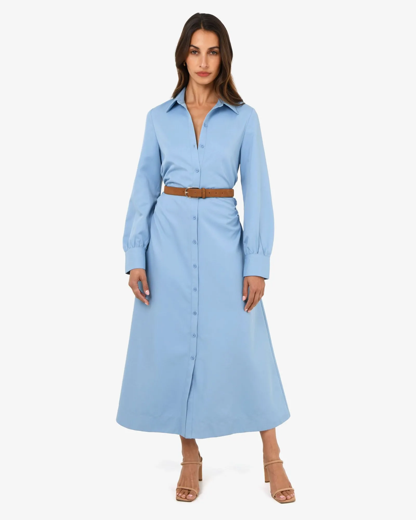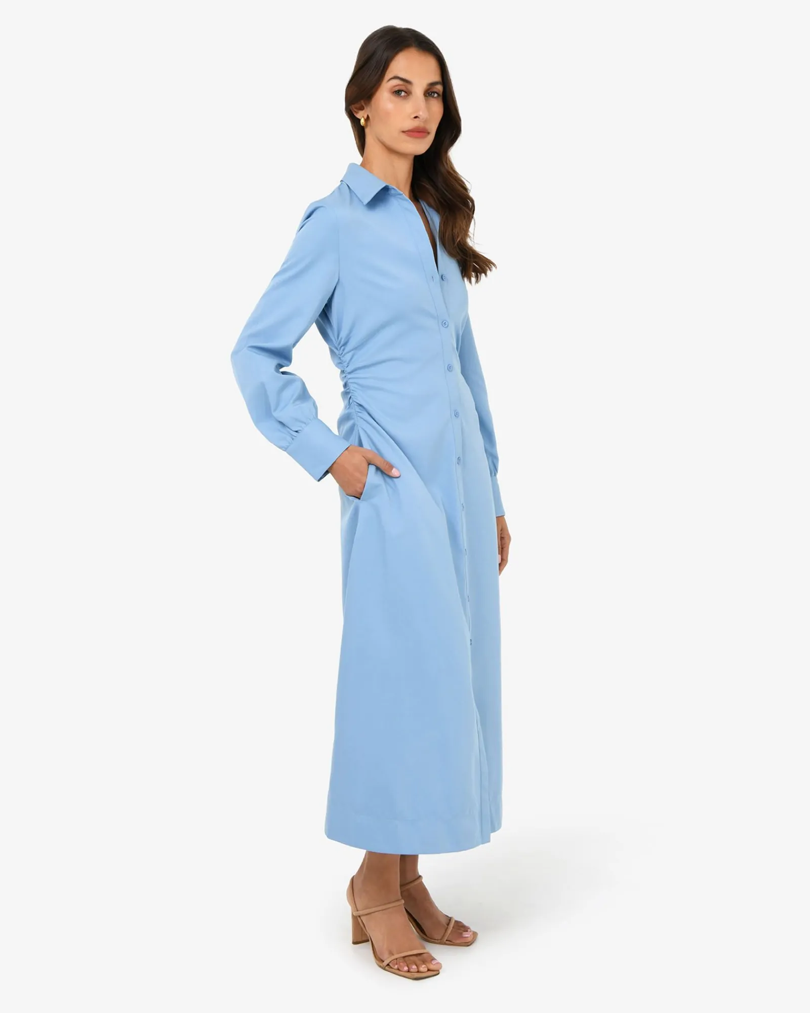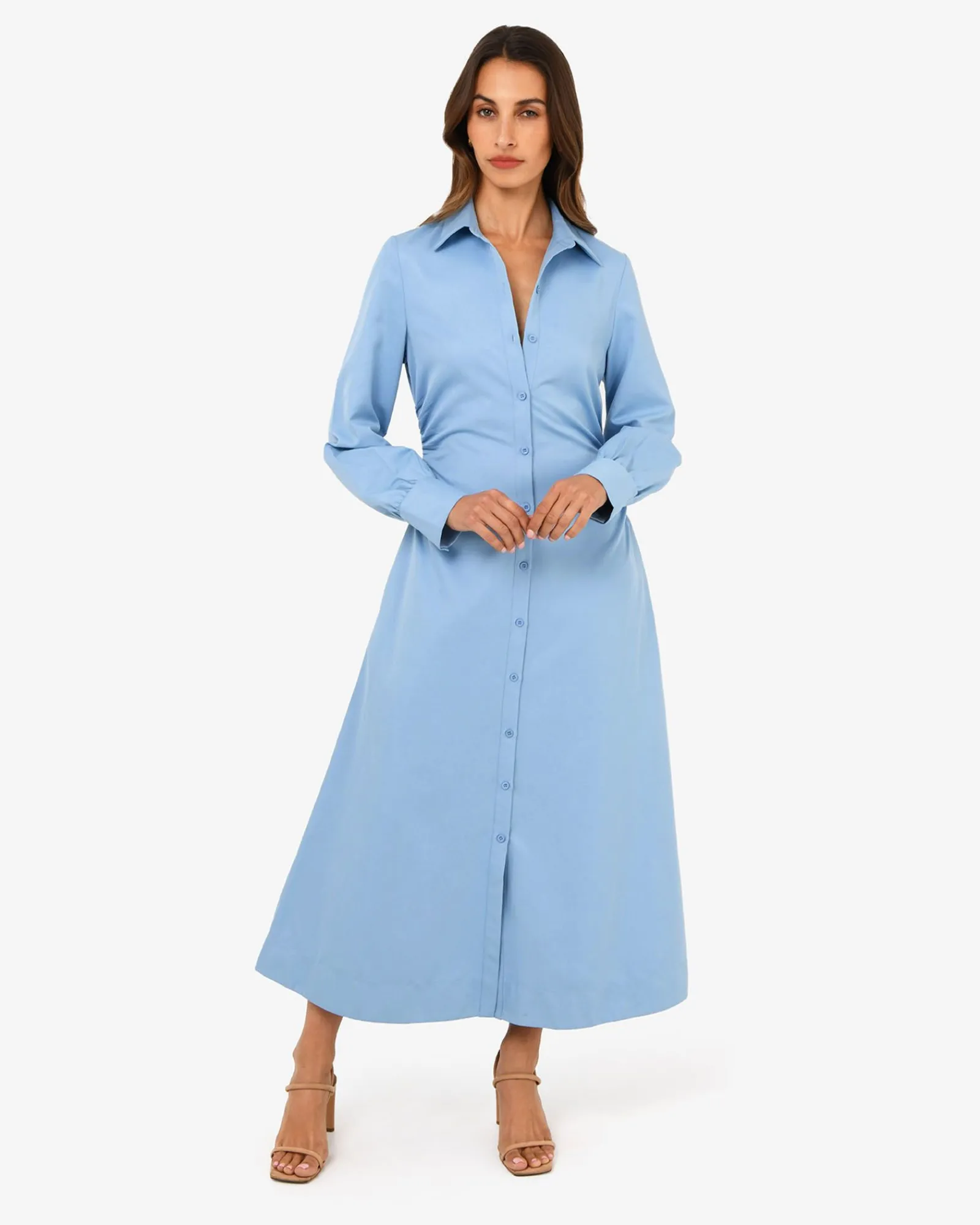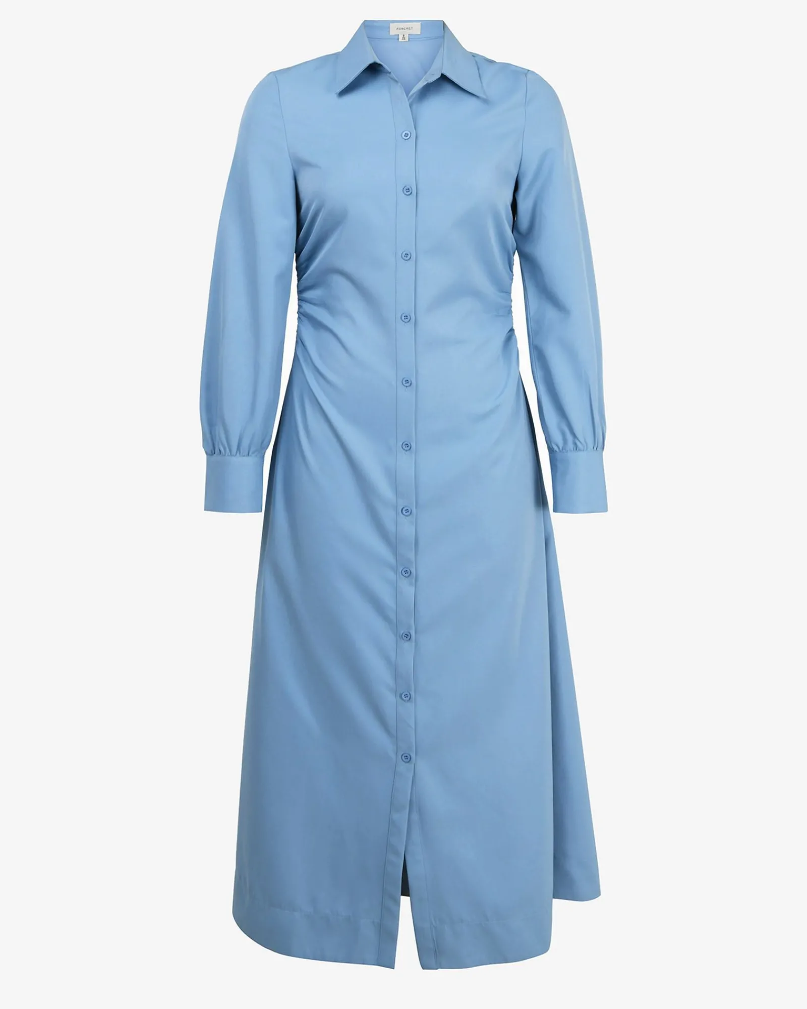 The Lune Ruched Shirt Dress cinches at the waist with delicate side ruching, highlighting your shape while offering all-day comfort. A full row of tonal buttons add a refined touch, giving you adjustable coverage from collar to hem. With its structured collar, and a classic shirt dress silhouette, it is a versatile piece – perfect for both your 9-to-5 and weekend wear.