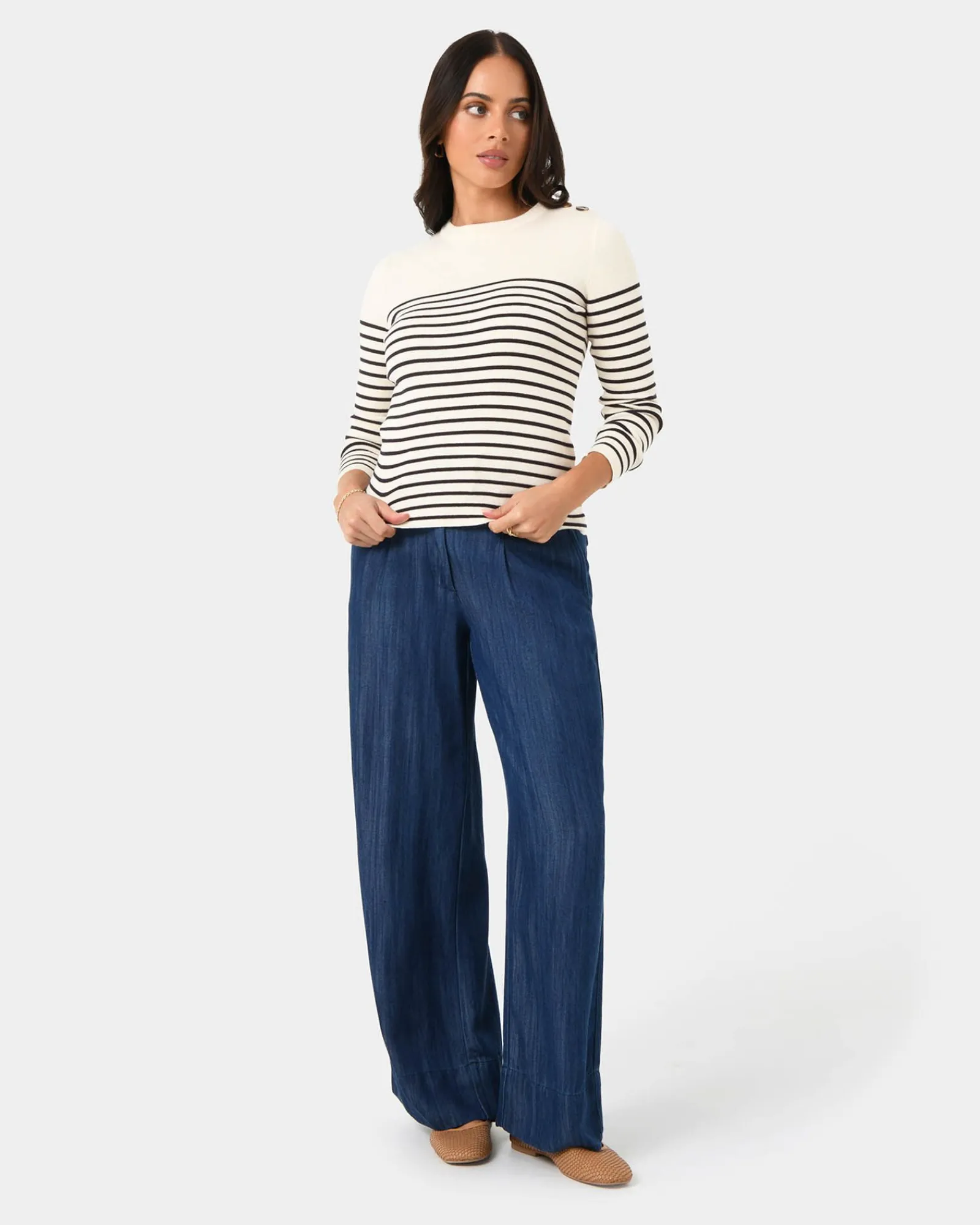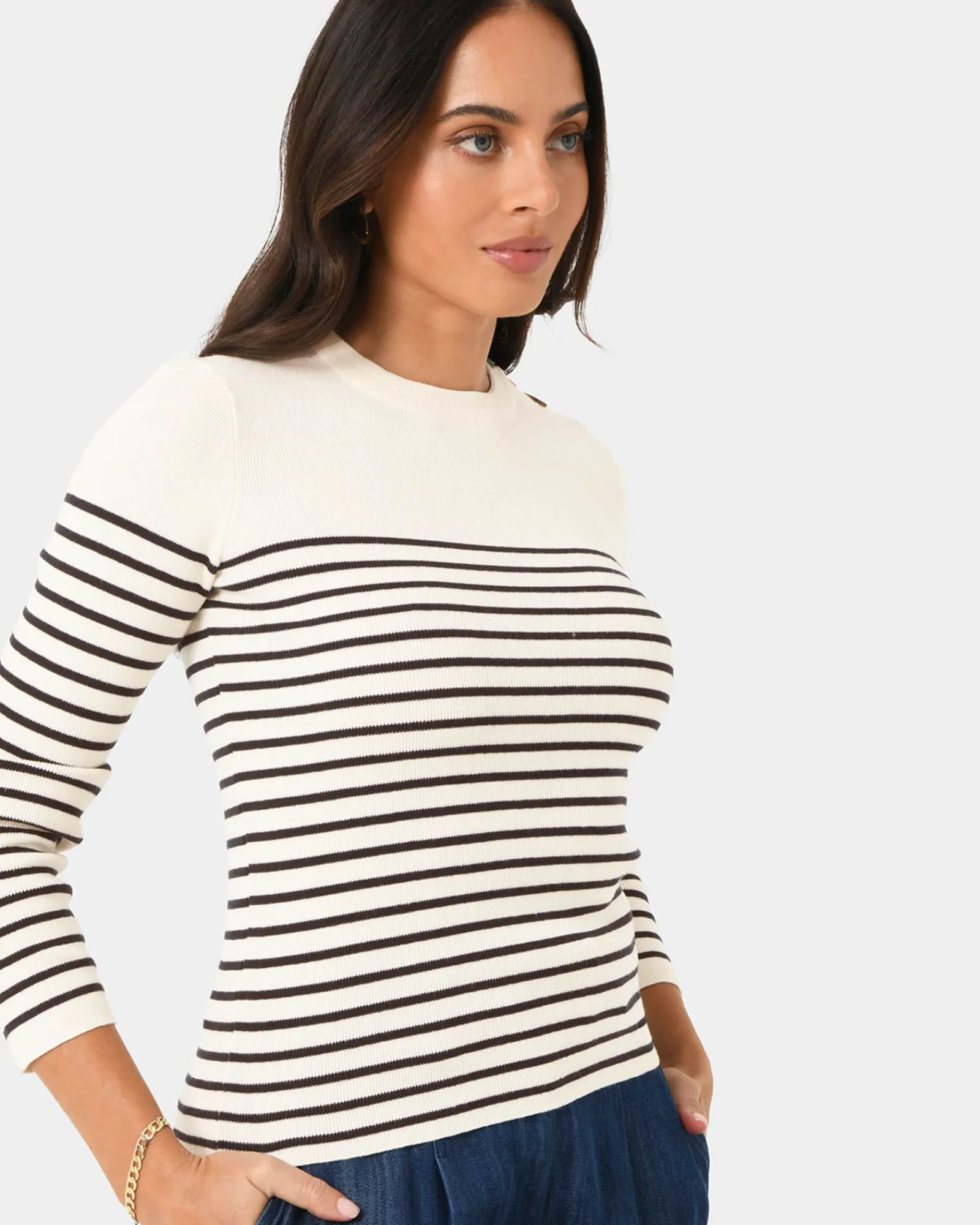 Timeless and chic essential, the Margot Long Sleeve Knit is a must-have staple. Made from a soft cotton blend, it features a classic crew neckline and long sleeves for a comfortable feel. The striped details is nautical inspired, while the functional buttons on the left shoulder offer a subtle stylish accent to the top.