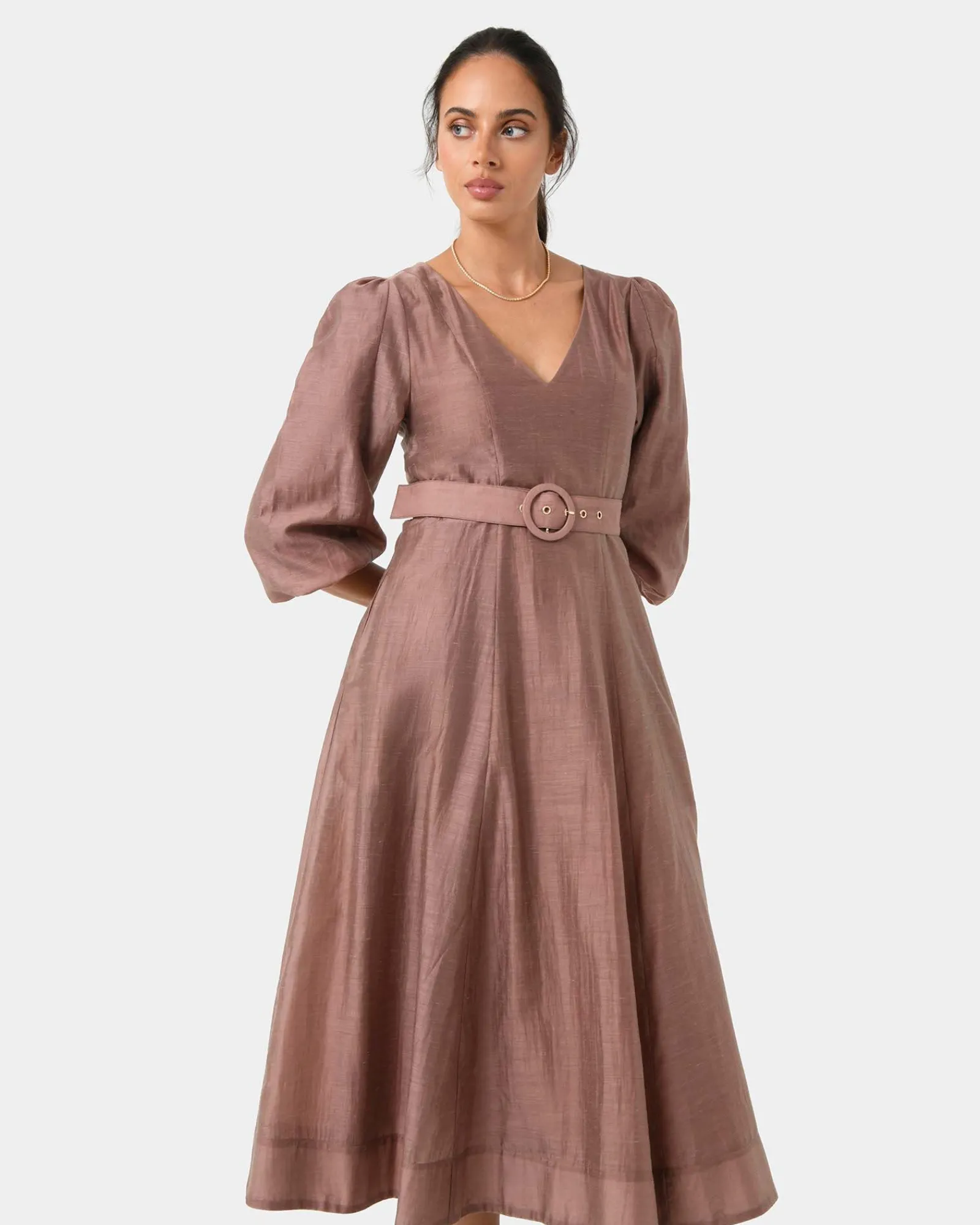 The Marlie Puff Sleeve Midi Dress is a timeless yet modern piece. Designed with a flattering V-neckline, soft puff sleeves, and a flowing A-line skirt, it offers both elegance and comfort. The matching self-covered belt cinches the waist, highlighting a delicate round buckle. Style it with heels and subtle accessories for an effortlessly chic look, whether for brunch, a special event, or an evening out.