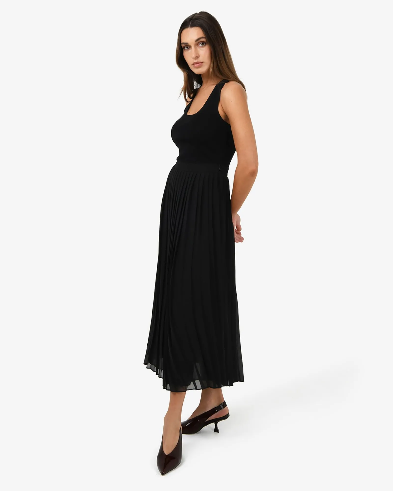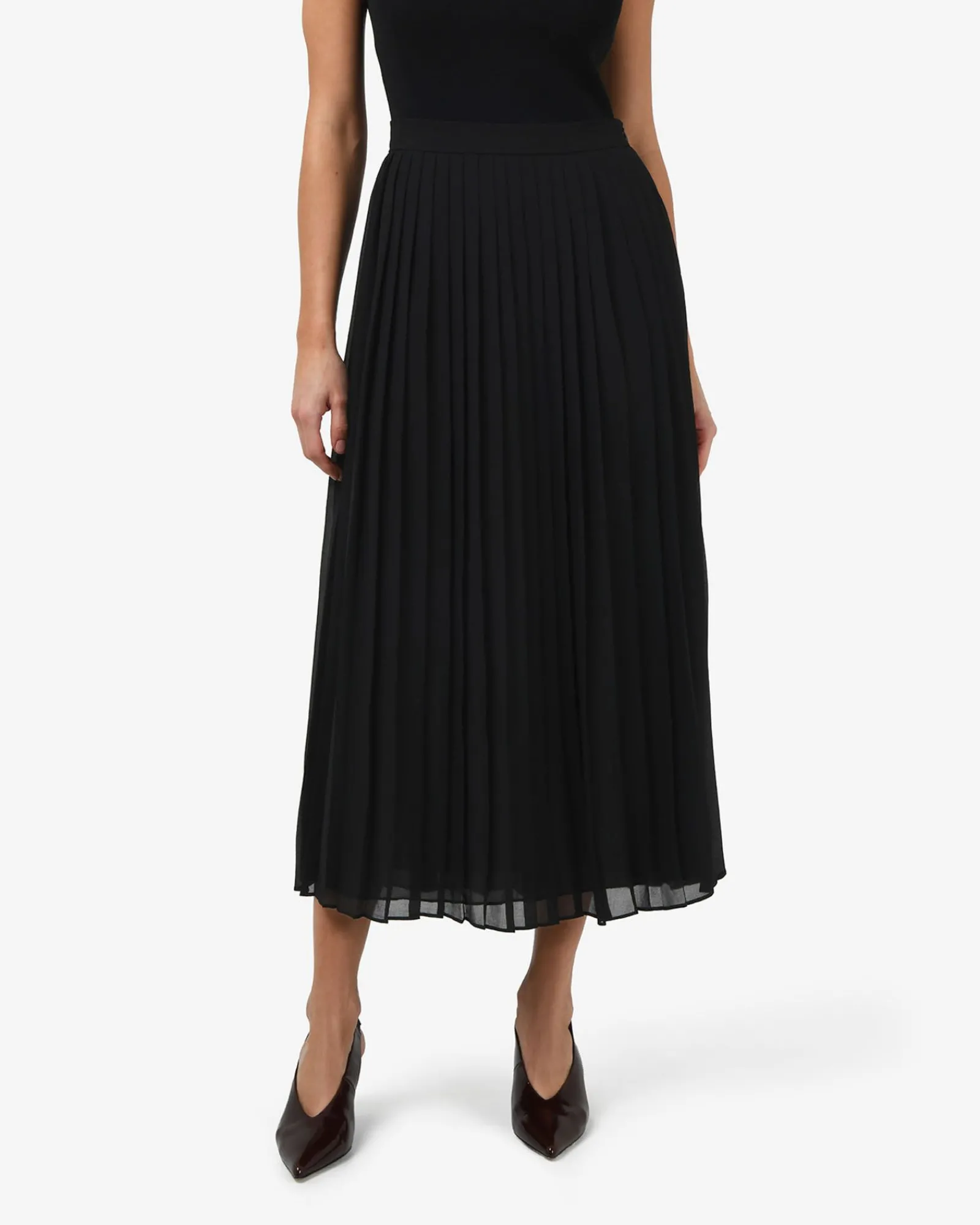 The Melina Pleated Skirt features knife pleats that create volume and movement across a straight silhouette. Designed from lightweight, semi-sheer chiffon with a touch of stretch and fully lined for comfort, it has a fixed waistband with an invisible side zipper closure. A versatile wardrobe piece, it pairs effortlessly with tops or blouses for a chic look from day to night.
