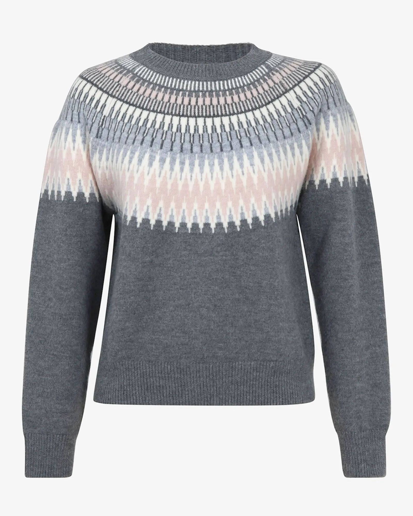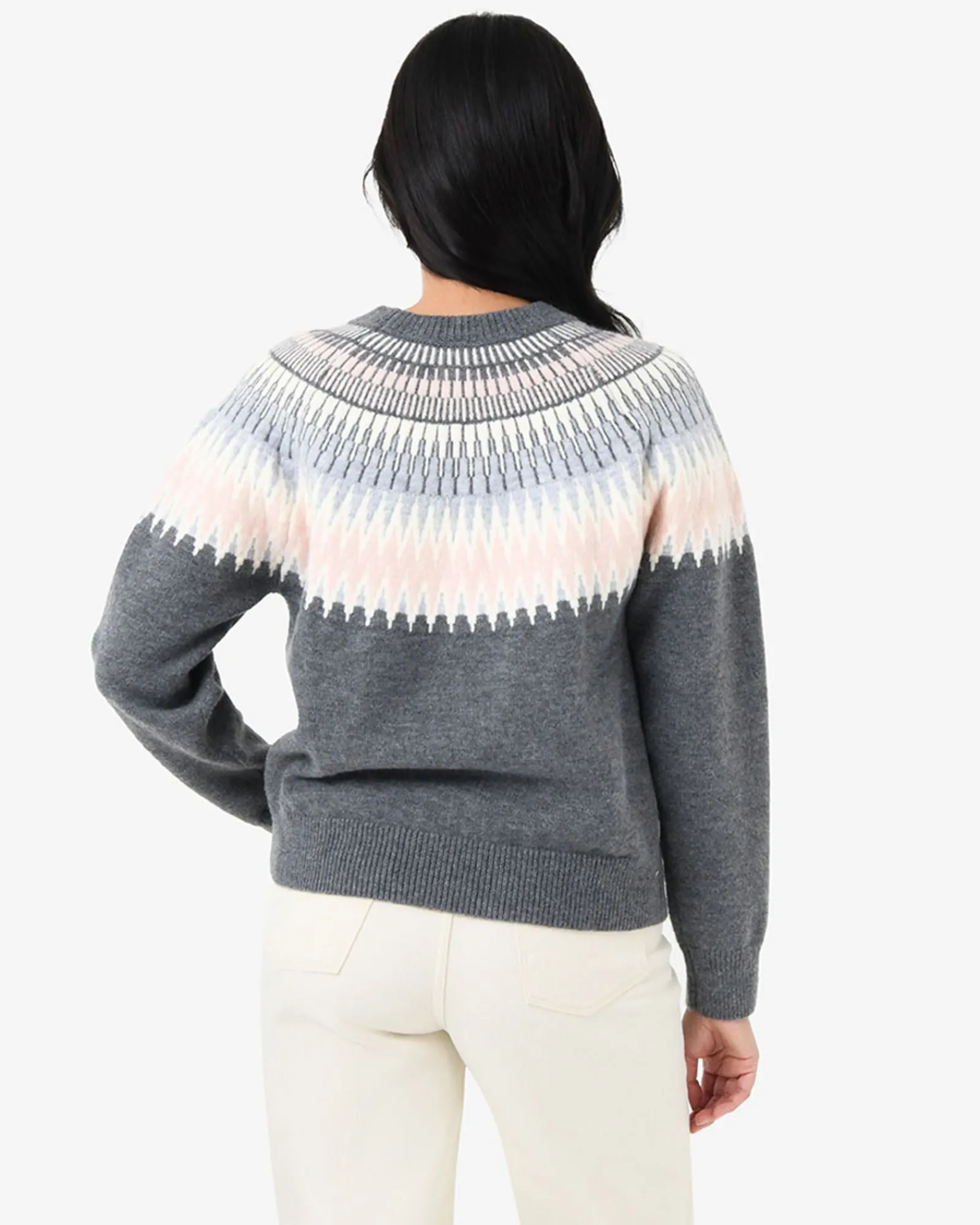 Cozy up in the Natasha Fair Isle Sweater, where soft shades of pink, grey, and off-whites form an intricate geometric pattern. Gracefully framing the neckline and shoulders, the design blends elegance with everyday comfort.