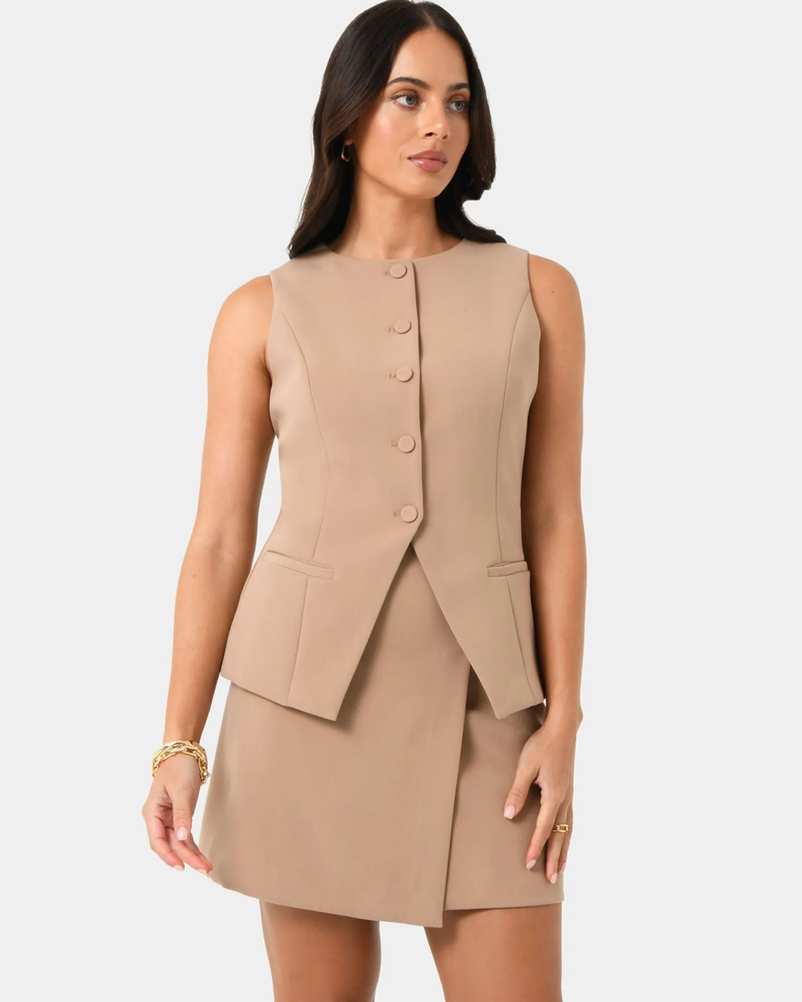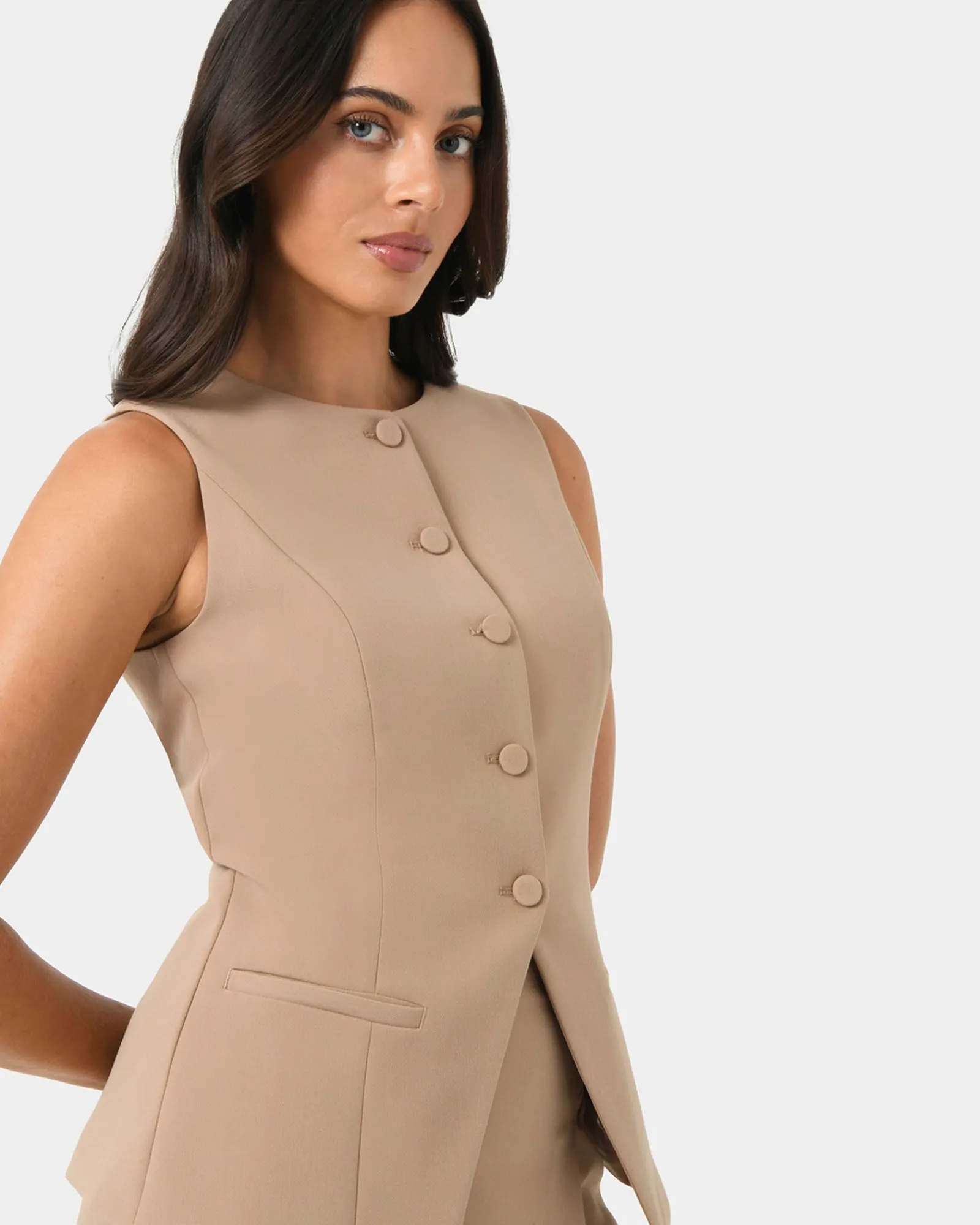 Stay sharp and stylish in this Nikki Longline Vest. Its tailored design and premium fabric make it perfect for work or casual outings. Complete the look by pairing it with the matching Nikki Tailored Wide Leg Pants.
