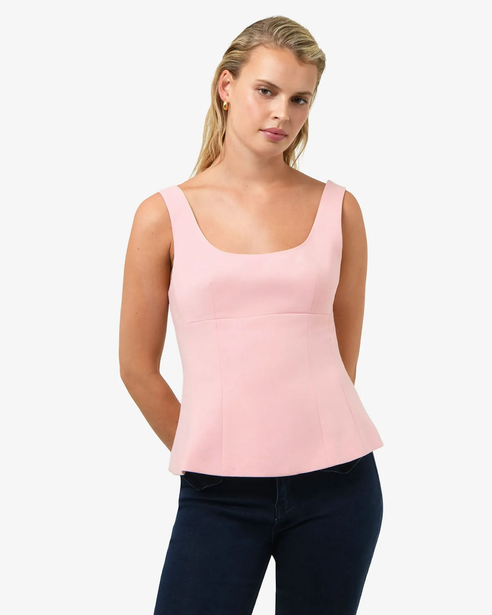 Enhance your silhouette with the Nikki Peplum Top. Designed with a fitted shape through the hips that flows into a softly flared peplum hem, this sleeveless top offers a flattering finish. With its scoop neckline, lightweight structured fabric, it’s a polished and versatile piece – perfect for work or special occasions.