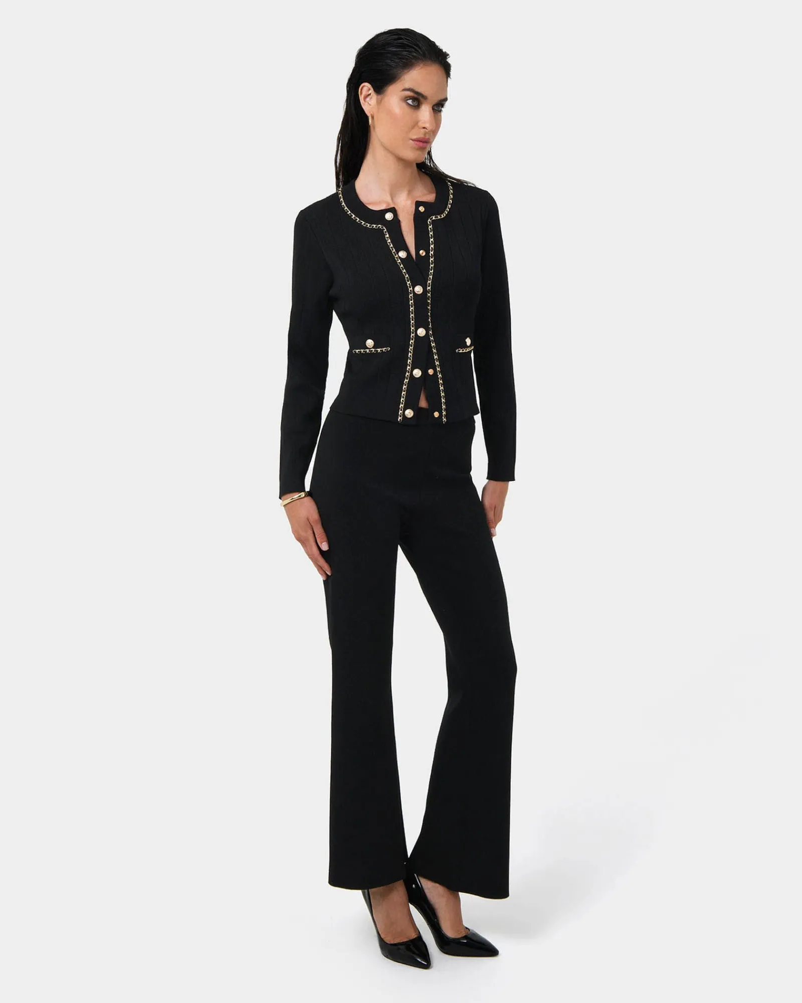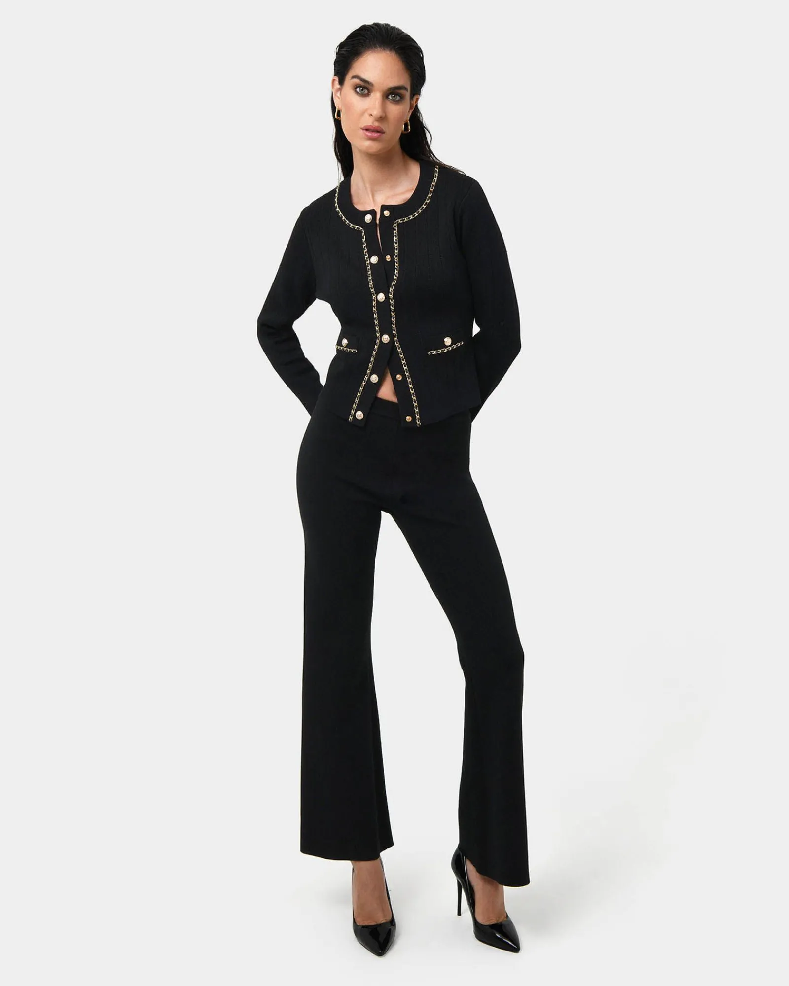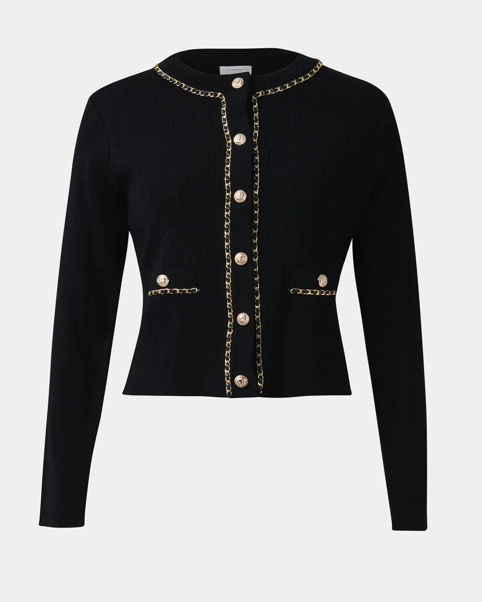 The Rachel Chain Cardigan offers a fresh take on outerwear. With stylish elements featuring chain detailing and elegant gold accents, it will elevate your everyday style with the perfect blend of sophistication and chic.