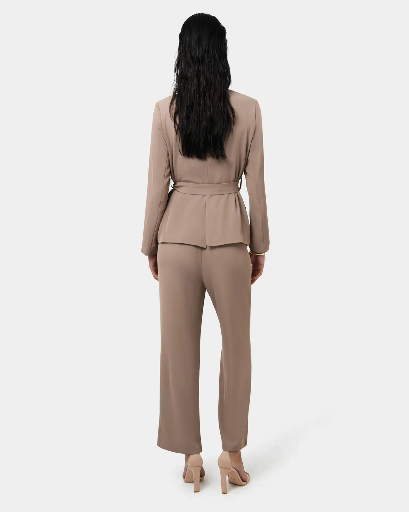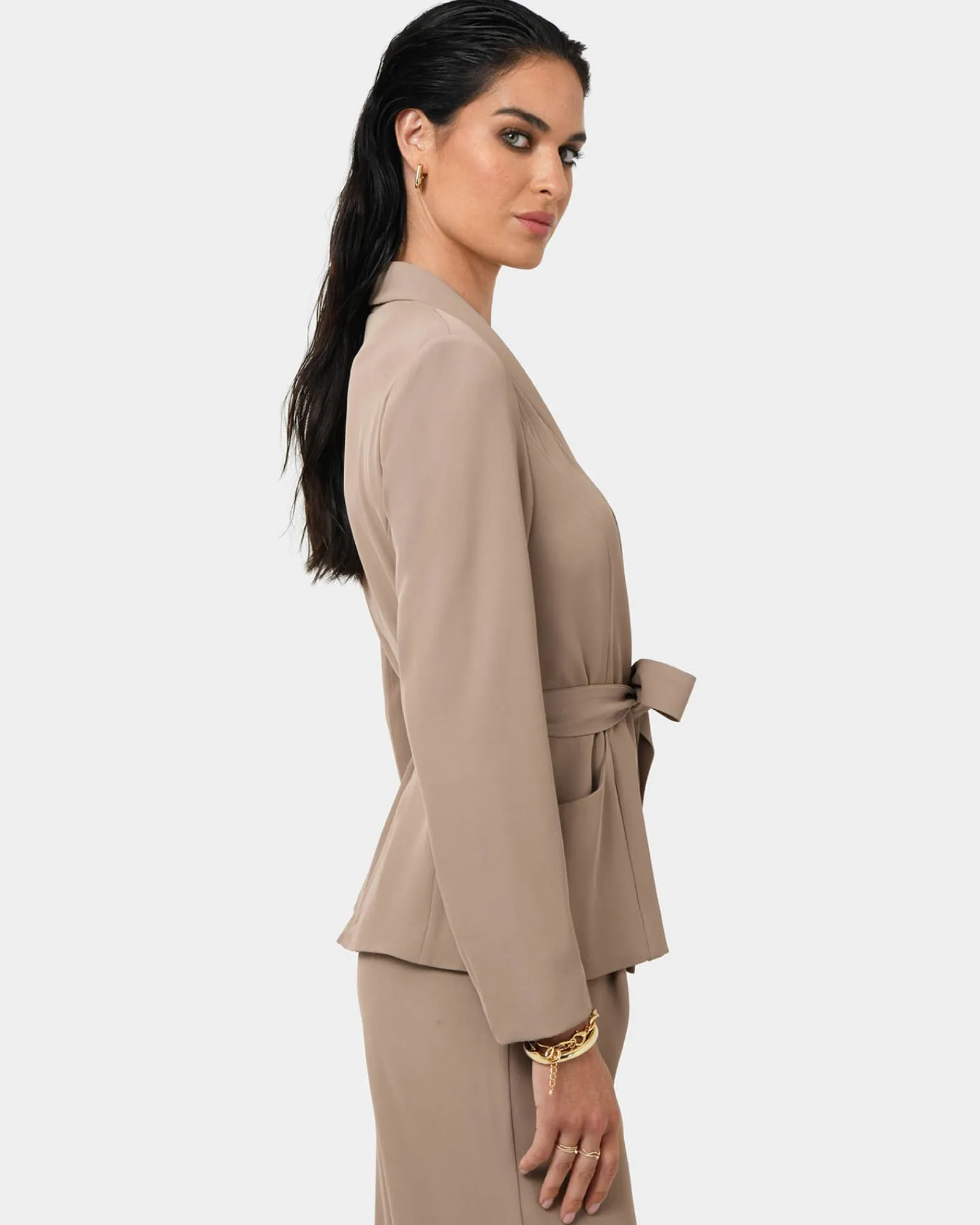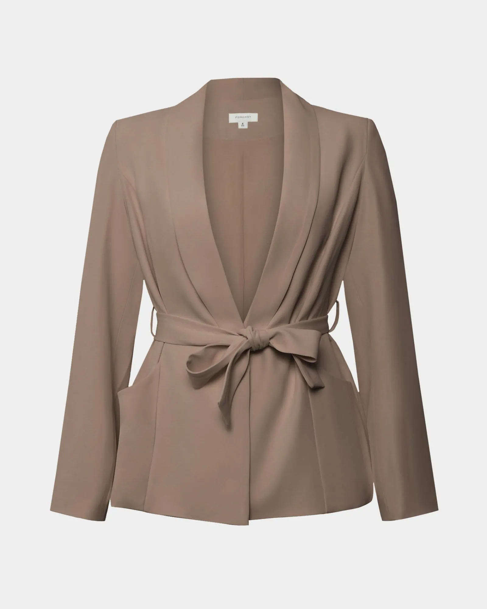 The Rain Belted Blazer is a chic and versatile piece with a matching belt at the waist. It features shawl lapels and functional pockets, making it perfect for both work and casual outings.