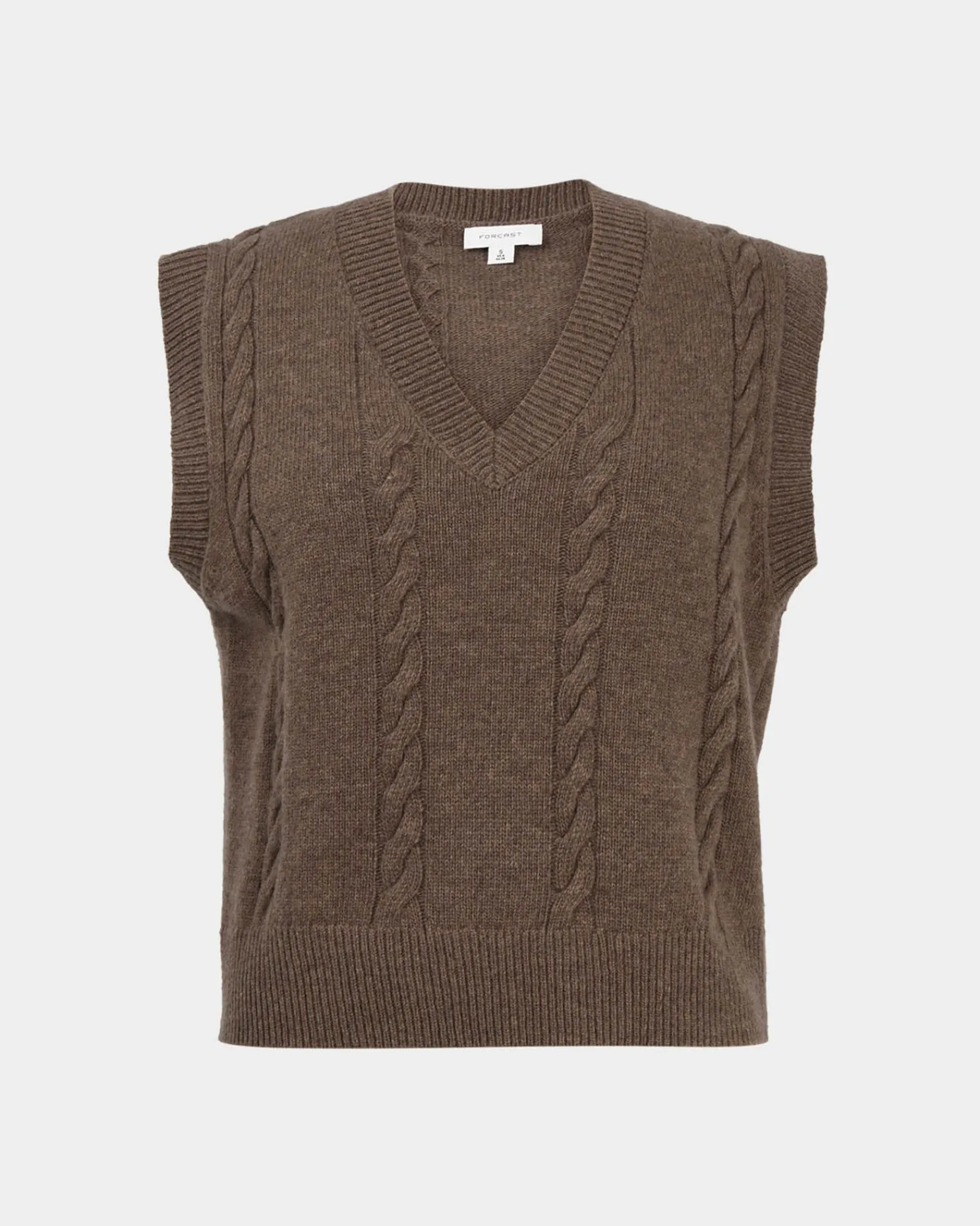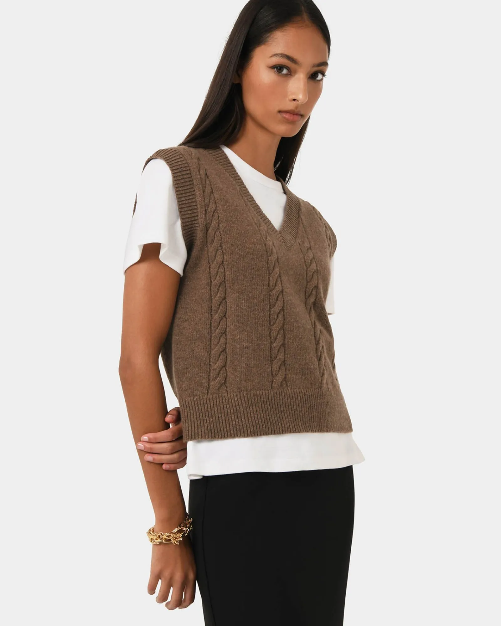 Perfect for effortless layering, the Rulia V-Neck Vest features a classic cable knit design with ribbed edges for a refined touch. Made from a lightweight, stretch fabrication, it offers a relaxed fit and a flattering V-neckline for a statement look.