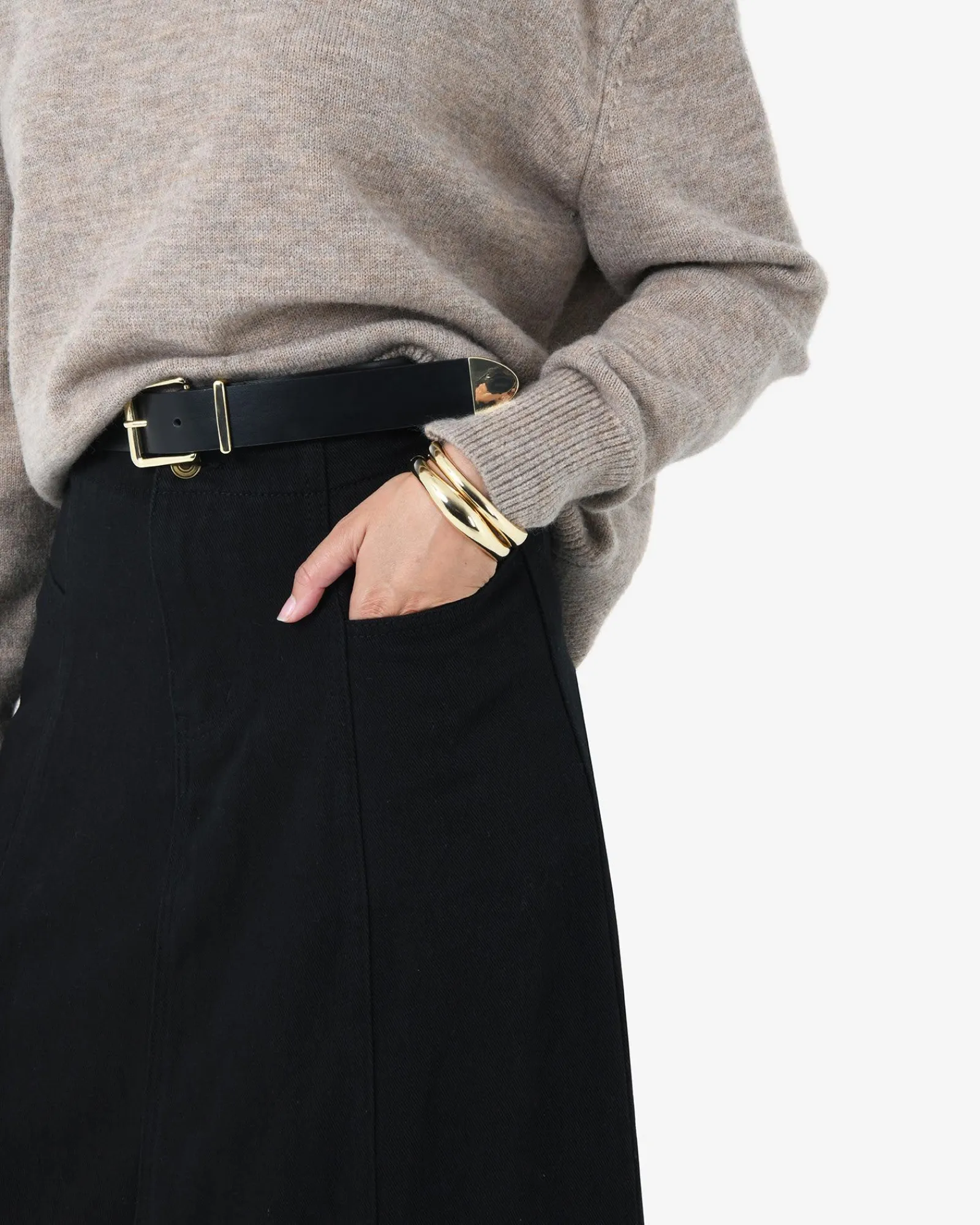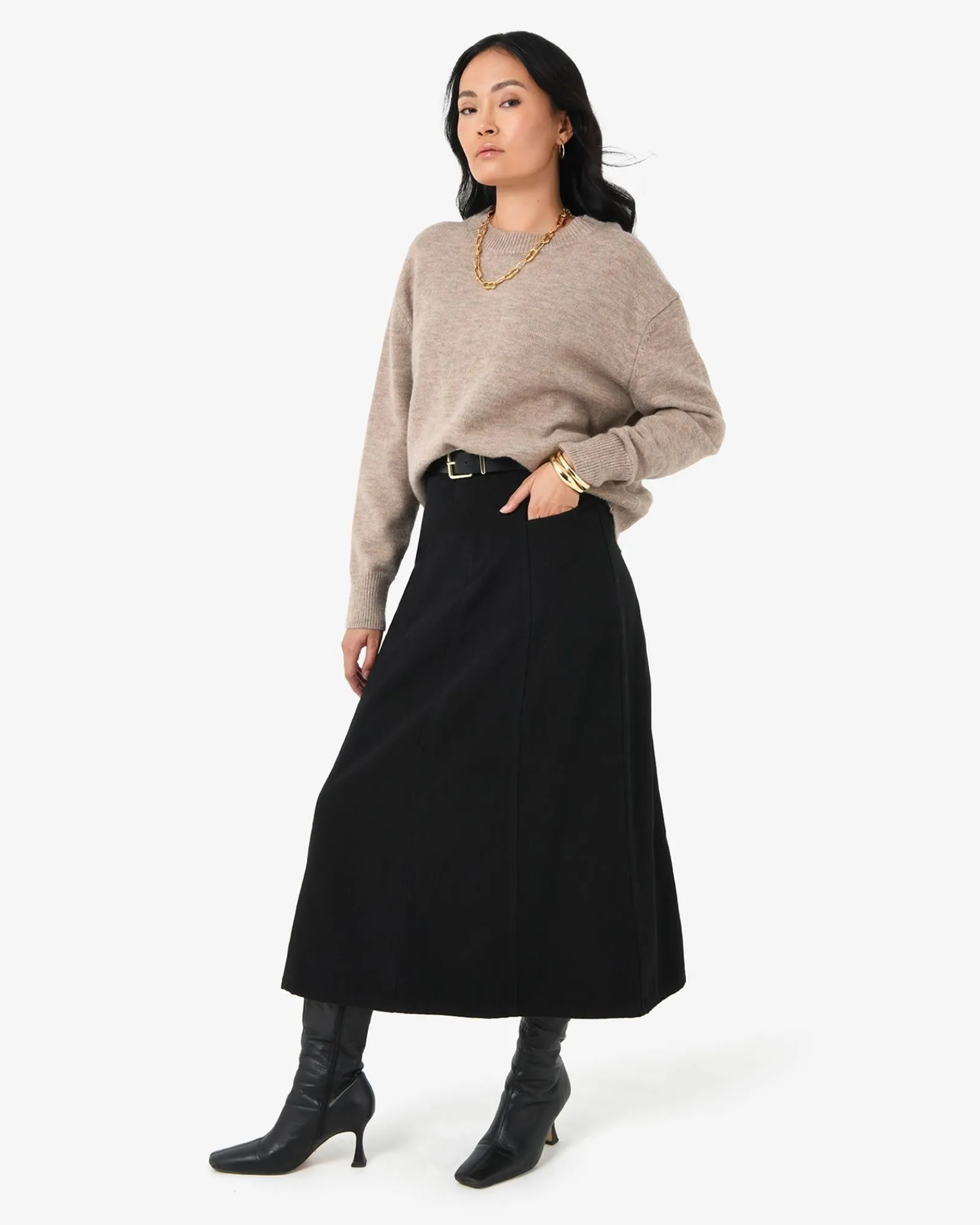 - Midi length A-line silhouette skirt