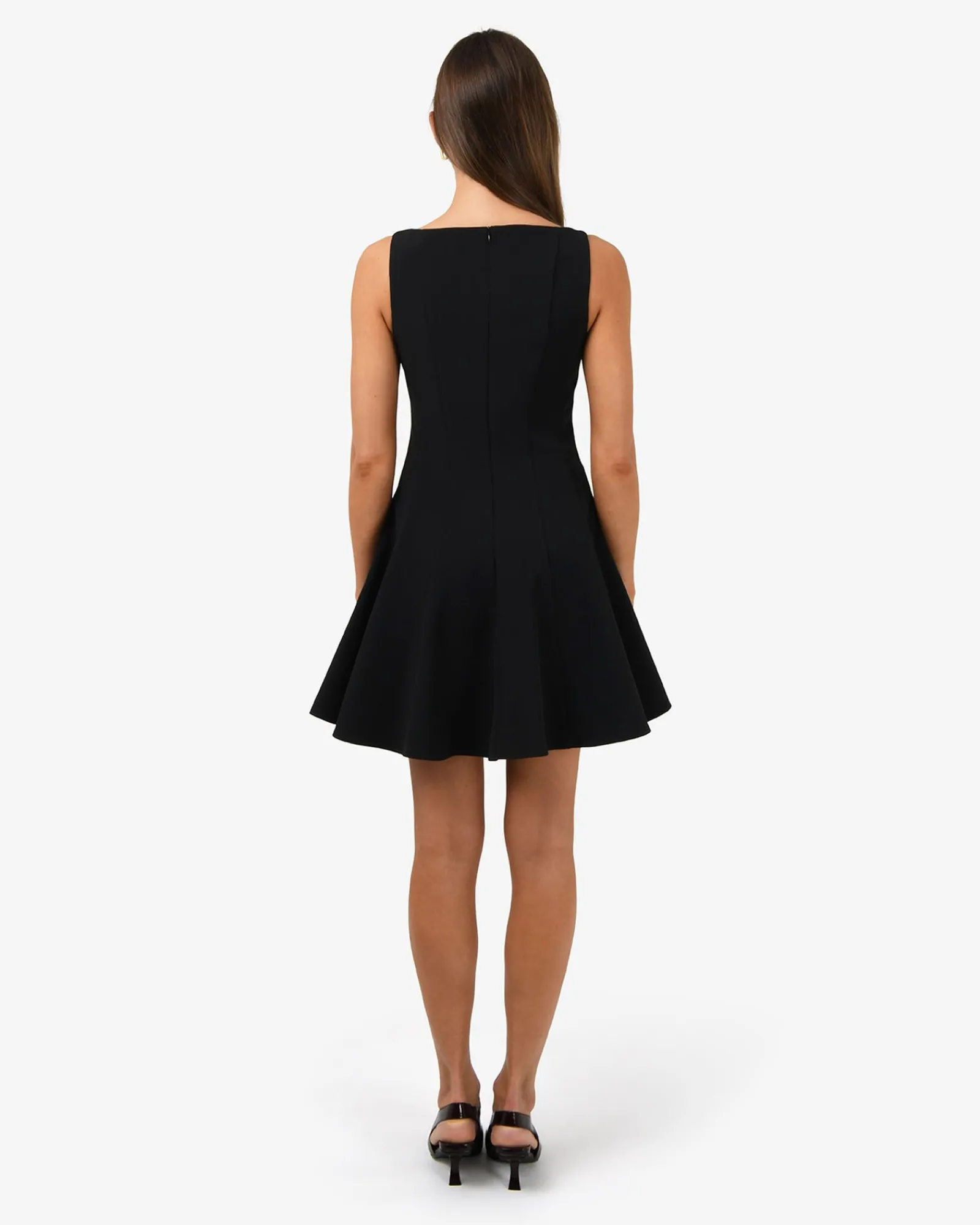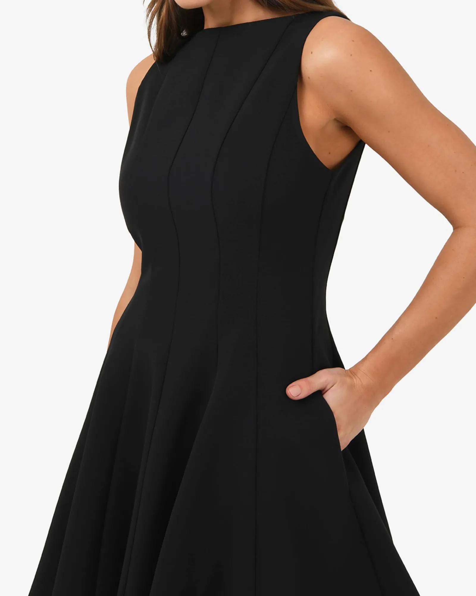 The Sandy Panel Mini Dress is sleek, structured, and effortlessly flattering. Fitted at the bodice and waist with a skater-style skirt, it shapes your silhouette beautifully. Panel details add subtle elegance, while the boat neckline and sleeveless design keep the look contemporary. Perfect for cocktail events, special occasions, or a chic night out.