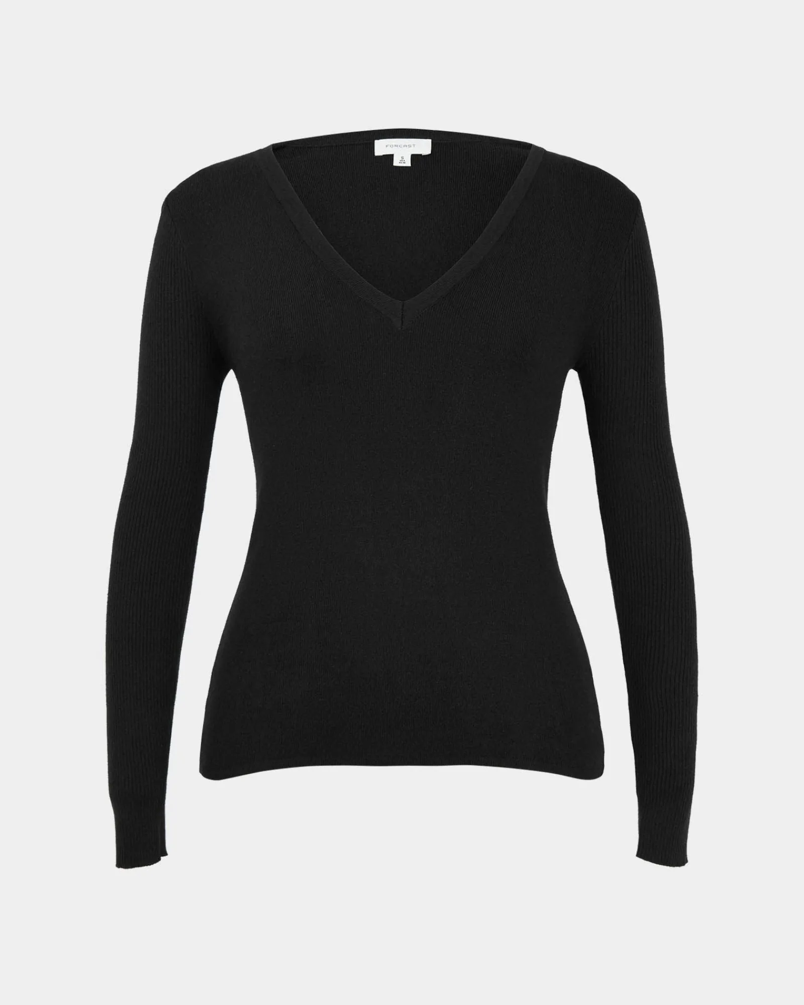 The Vicky V-Neck Knit is a sleek and sophisticated wardrobe essential. Featuring a statement V-neckline and long sleeves, it has ribbed detailing on the sleeves for added texture. It is medium weight with stretch fabrication offering a body hugging fit for all day comfort.