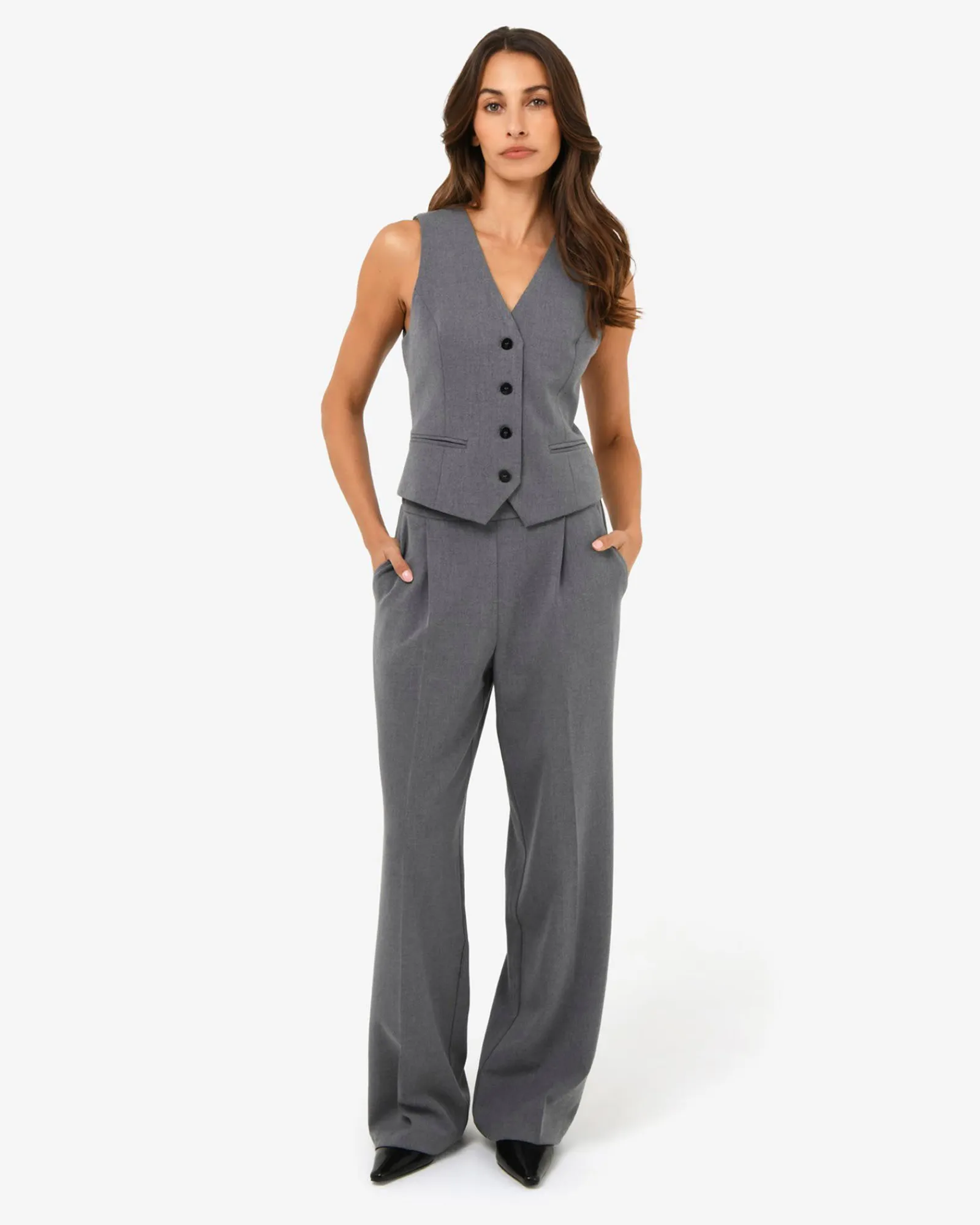 The Westwood Tailored Vest brings a sharp finish to any look with its sleeveless V-neck cut, contrasting buttons, and a structured flattering fit. Fully lined and refined, it layers perfectly over shirts or under blazers. For a coordinated ensemble, pair it with the matching Westwood Elastic Waist Pants and Skirt.