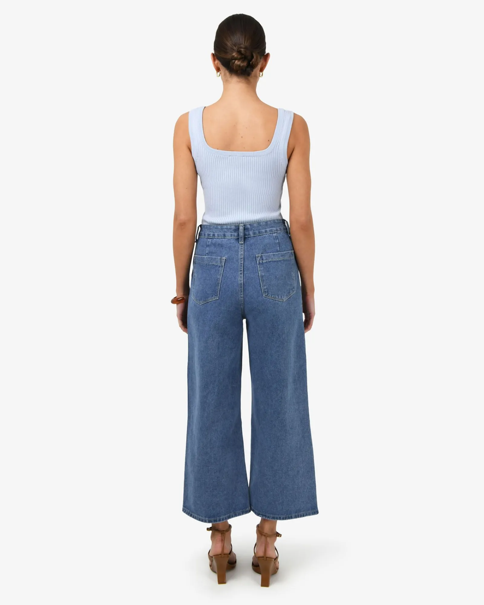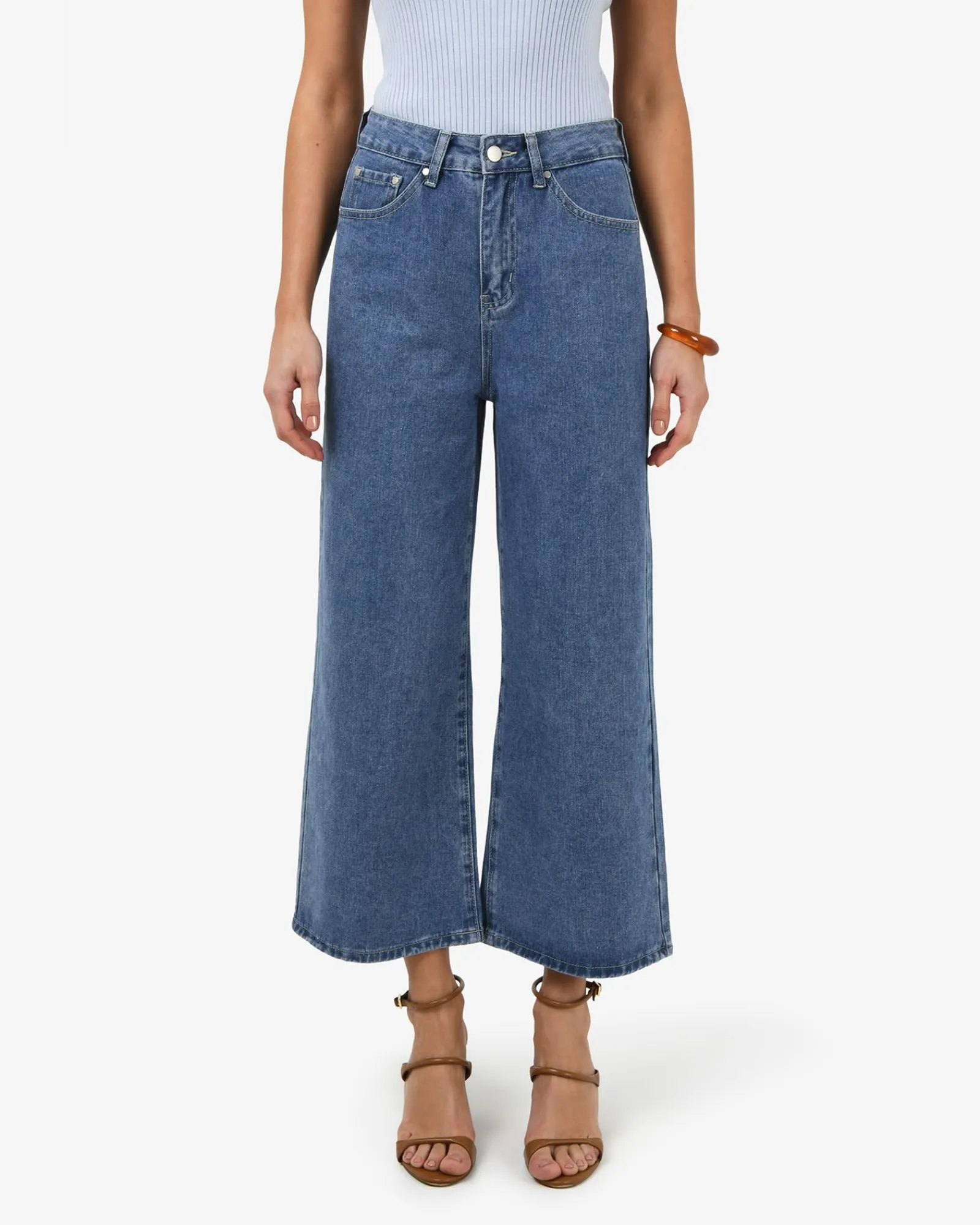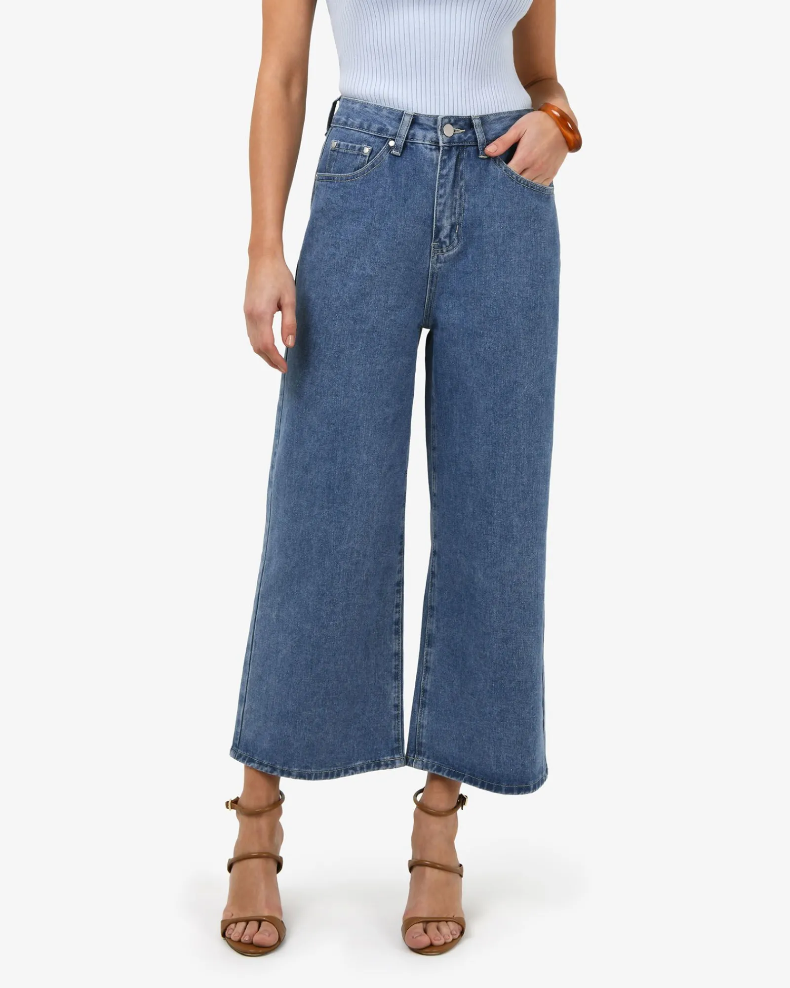 Update your wardrobe with the Windsor Cropped Wide Leg Jeans, a summer-ready denim staple. Featuring a high-waisted fit, wide-leg cropped cut, and a classic mid-wash blue, these jeans deliver comfort and style in one. Perfect to pair with basic tops or statement blouses.
