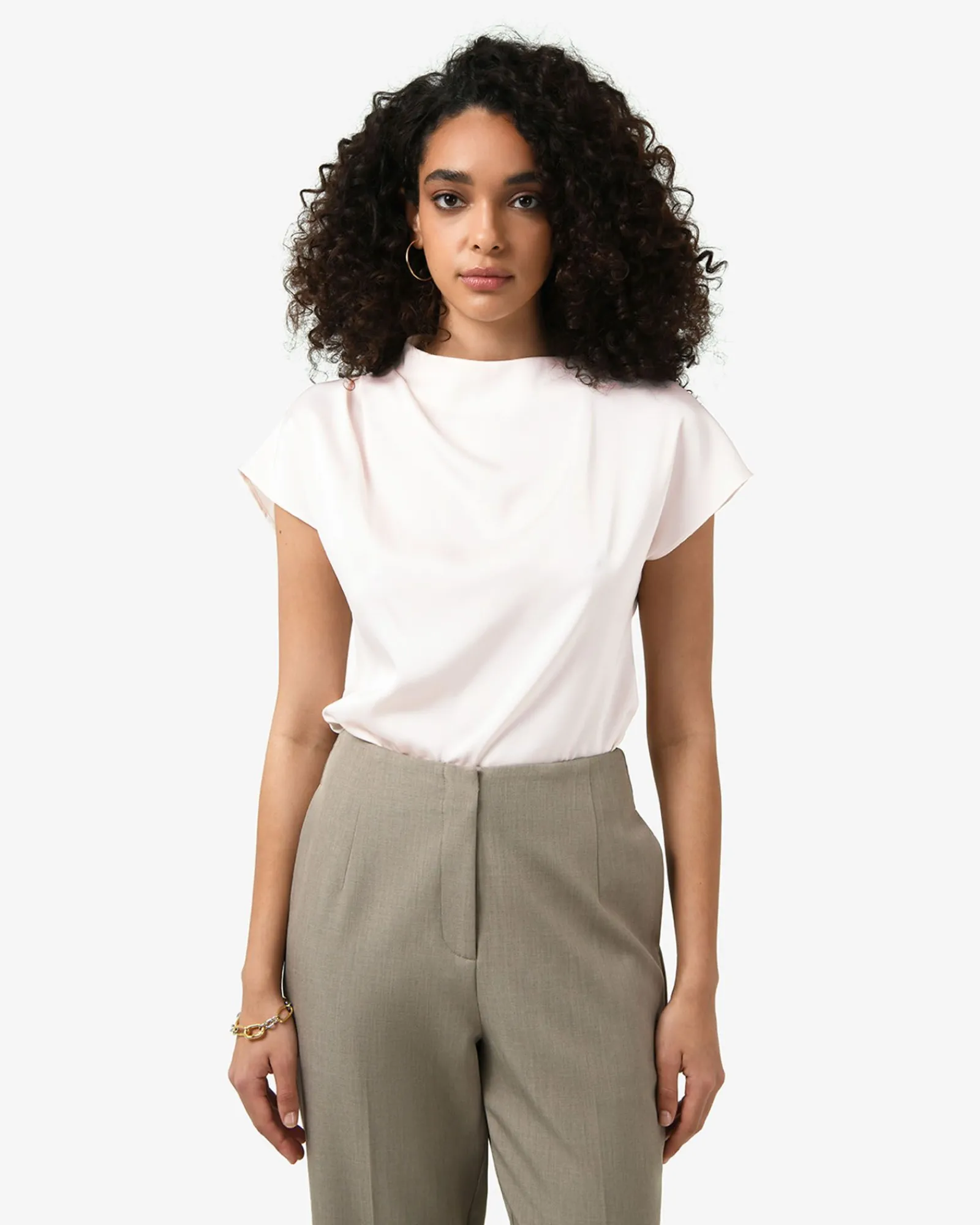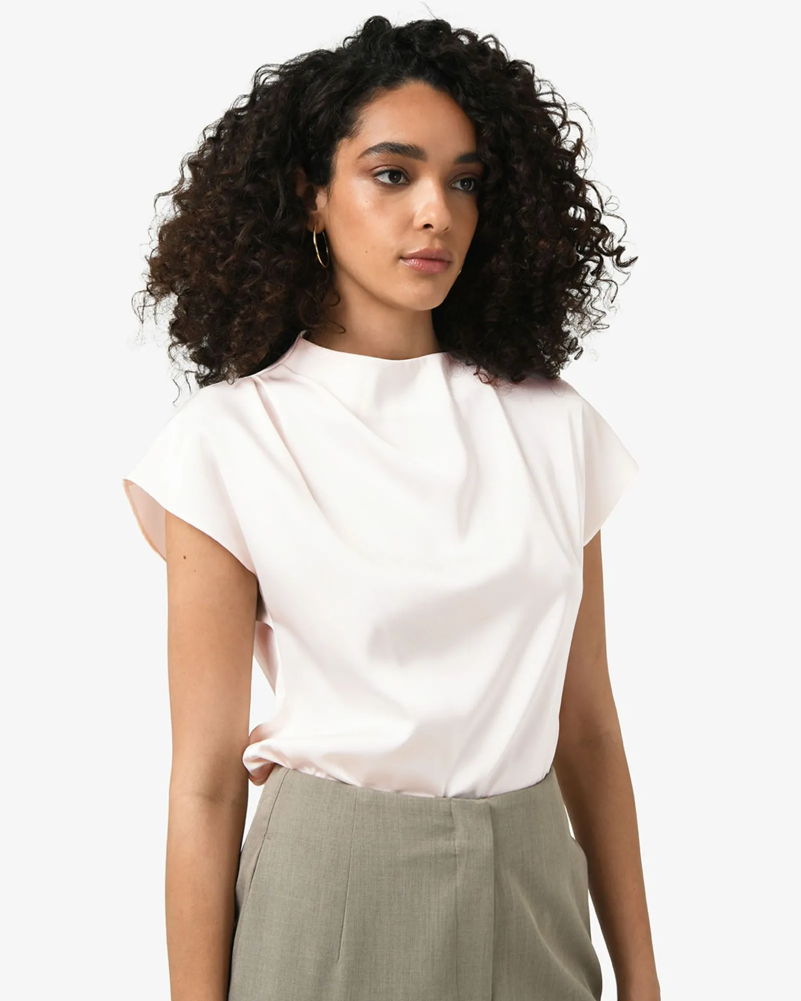 The Zafina Pleated Draped Top features an asymmetric pleated draped neckline, short cap sleeves and an invisible back zipper closure. Designed from lightweight fabric with a subtle sheen, the top can be styled with tailored pants for work or a sleek skirt for evening wear.